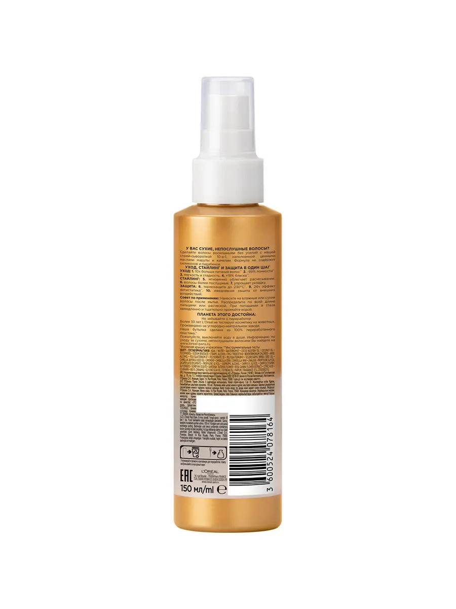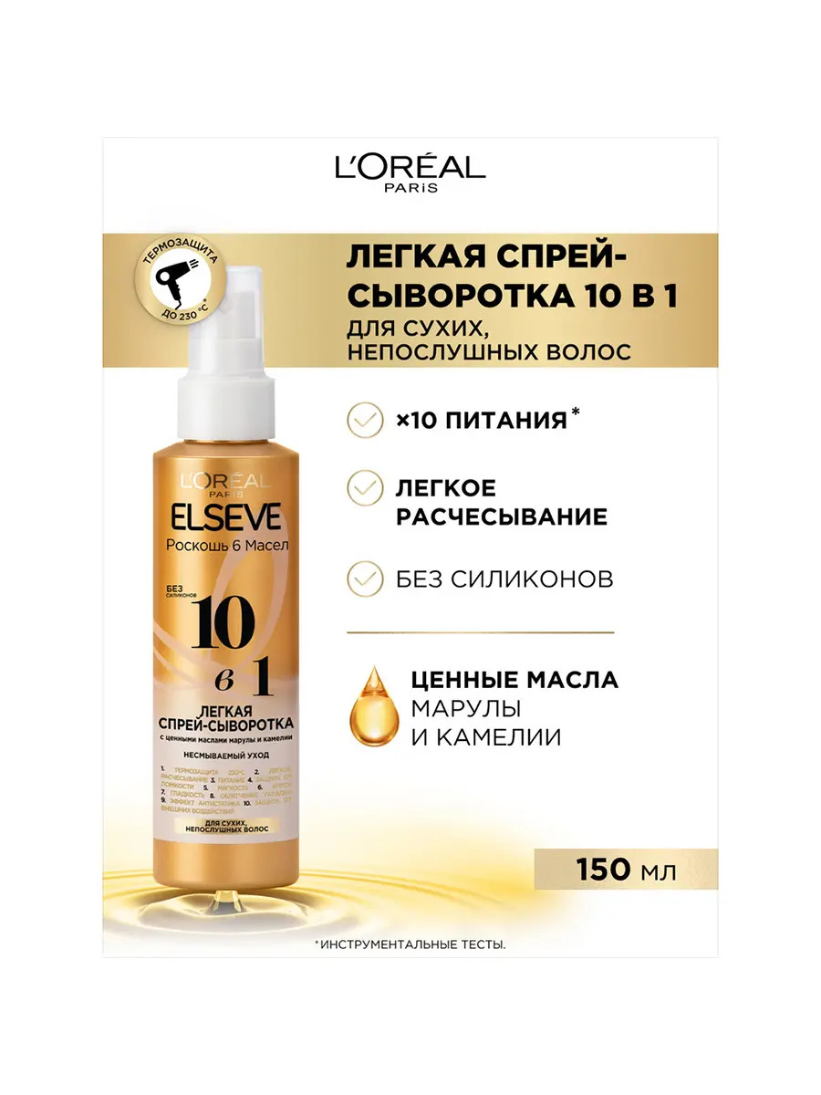 Лёгкая спрей-сыворотка для волос 10в1 L'OREAL Elseve с ценными маслами марулы и камелии 150мл