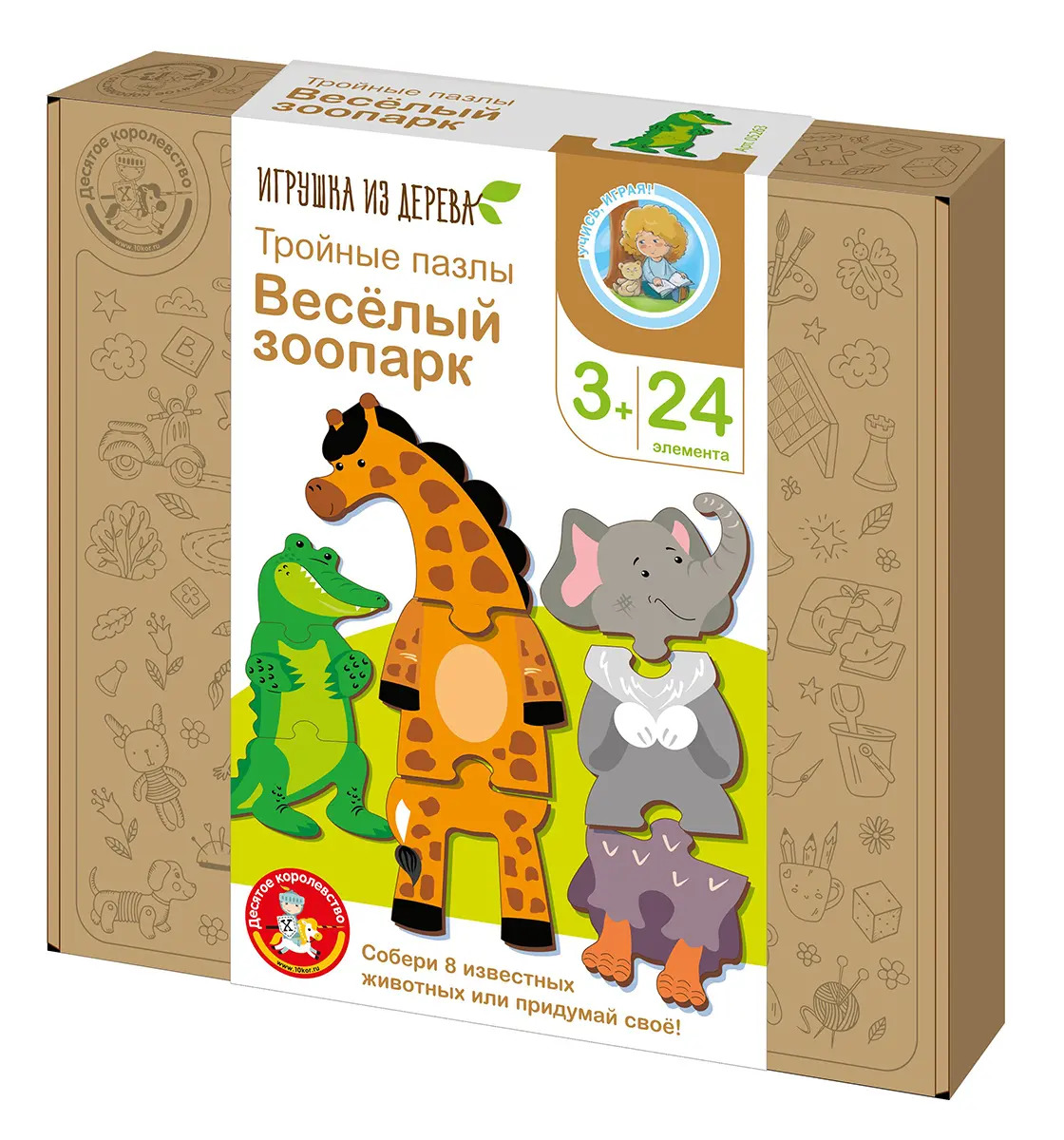 Пазлы деревянные Десятое королевство Тройные пазлы Веселый зоопарк 24 элемента