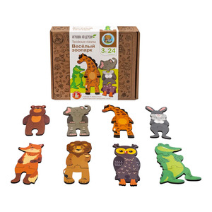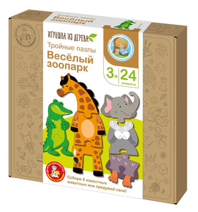 Пазлы из дерева. Тройные пазлы "Веселый зоопарк" 24 эл. Состав игры: 8 пазлов из древесного материала из 3 элементов каждый.Размер каждого пазла 6х13 см.Древесный материал, картон. Игра предназначена для детей старше 3 лет.