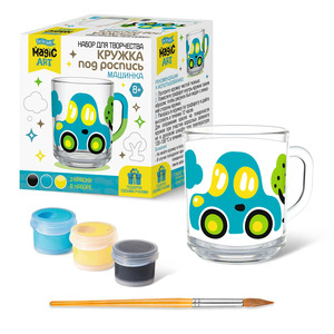 Набор для творчества. Кружка под роспись "Машинка".Состав набора: стеклянная кружка – 1 шт (высота 9 см, диаметр 7 см, 200 мл), акриловые краски – 3 шт (черная, голубая, желтая), рисунок-трафарет – 1 шт (16 х 7,5 см), кисточка – 1 шт (13,5 см). Материалы: бумага, стекло. Набор предназначен для детей от 8 лет.