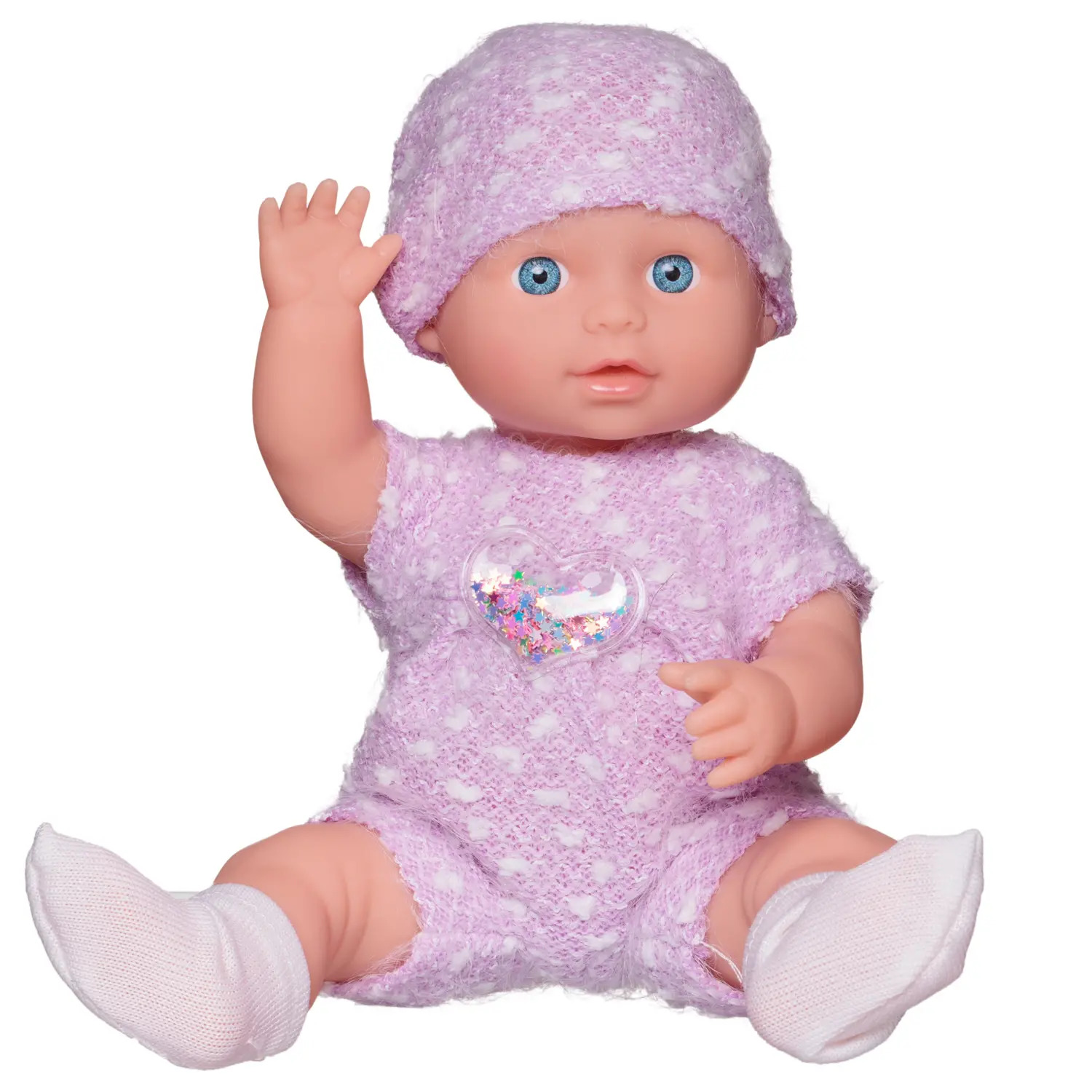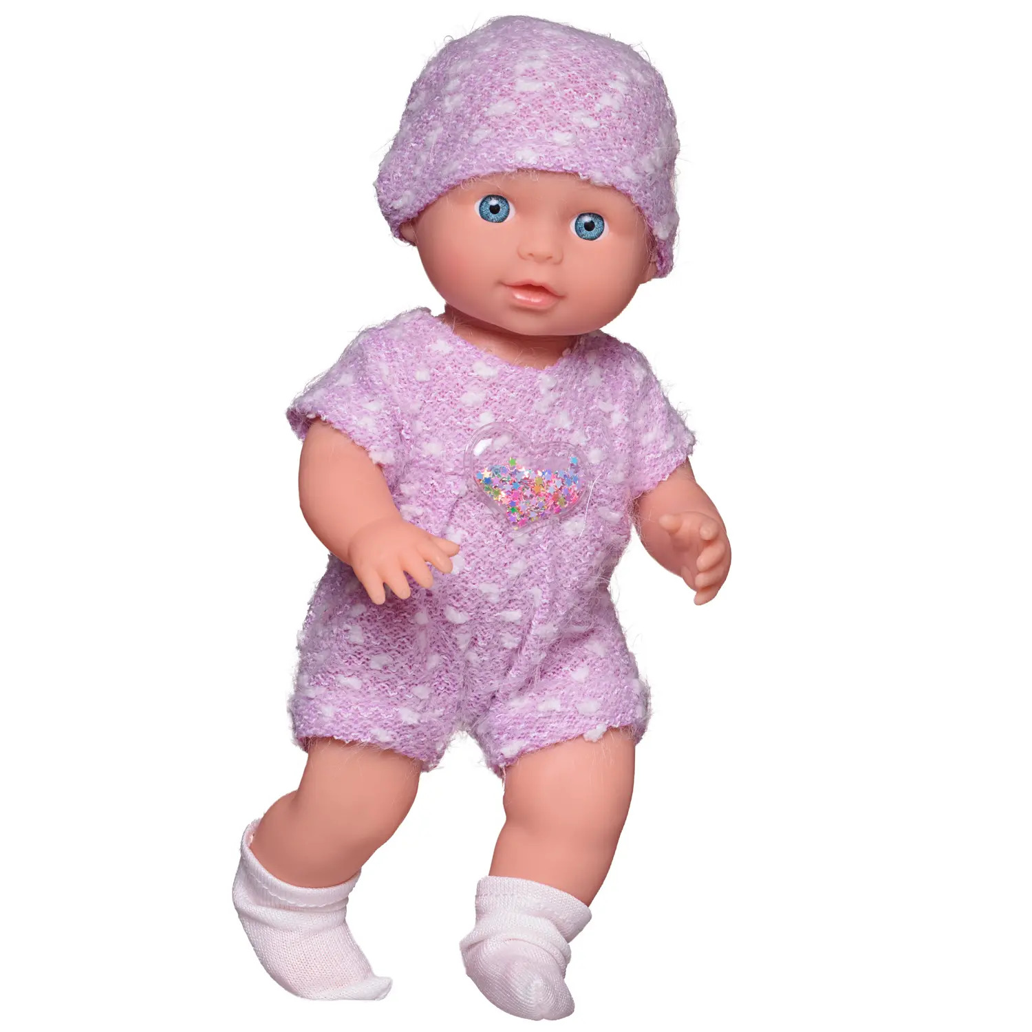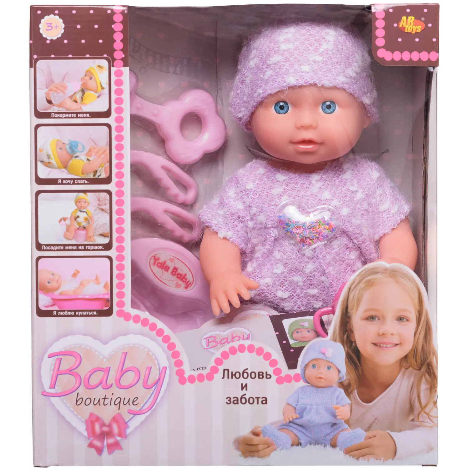 Очаровательный пупсик «Baby boutique» от бренда ABtoys выглядит как настоящий ребенок, его можно напоить из бутылочки и сразу посадить на горшочек. Пупсик одет в вязаные нежно-сиреневые комбинезон с аппликацией, шапочку и белые носочки. В процессе игры девочка научится ухаживать за малышами, стать ответственной, внимательной и заботливой. Дополняют набор различные игровые предметы.Высота пупса: 25 см.