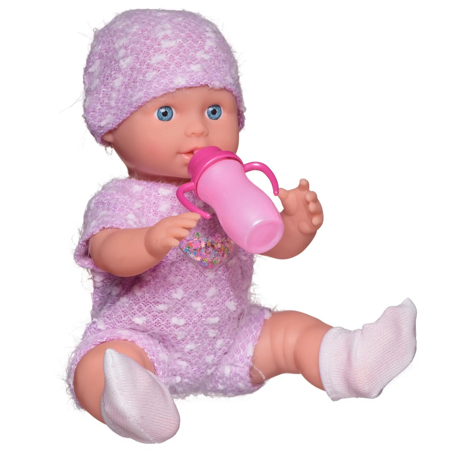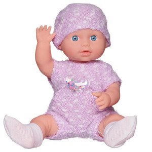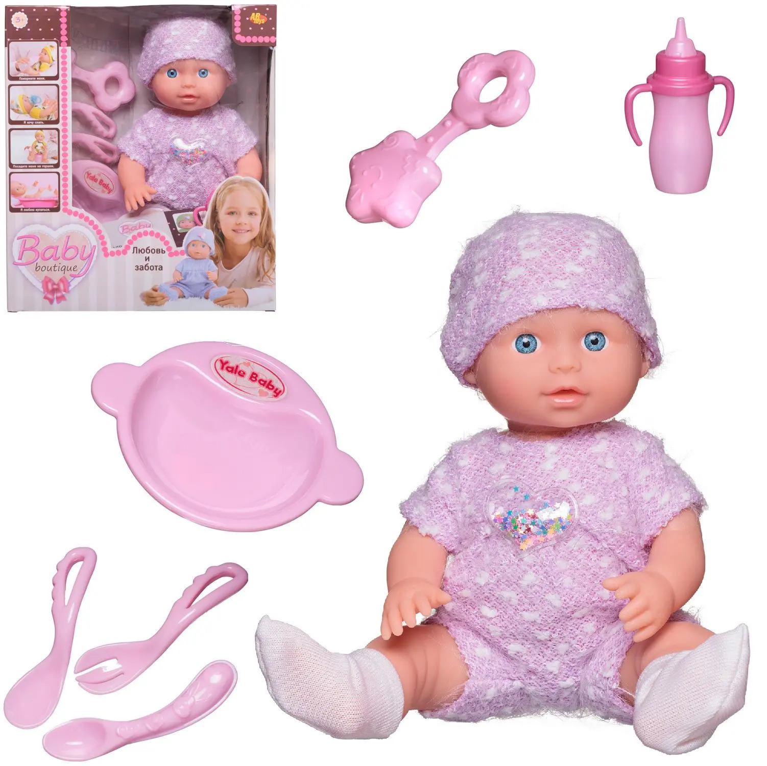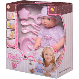 Комплектность: пупс – 1 шт., погремушка – 1 шт., ложка -1 шт., вилка – 1 шт., тарелка – 1 шт., бутылочка – 1 шт., игрушка для пупса – 1шт.,