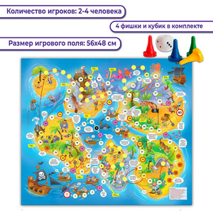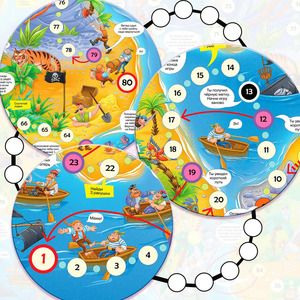 Традиционные игры-ходилки с кубиком и фишками («Кинь-двинь») направлены на развитие эмоций и умения общаться, а также играть по правилам. Это настоящая игра-приключение с забавными пиратами и смешными ситуациями, в которые они попадают, морскими чудовищами, запутанным маршрутом по островам в поисках сокровищ.Правила. Фишки ставят на старт и определяют первенство хода. В свой ход игрок бросает кубик и делает столько шагов по игровому полю, сколько очков выпало на кубике. Если фишка остановилась на специальной клетке, выполняют соответствующее действие. Выиграет тот, кто первым доберётся до финиша.