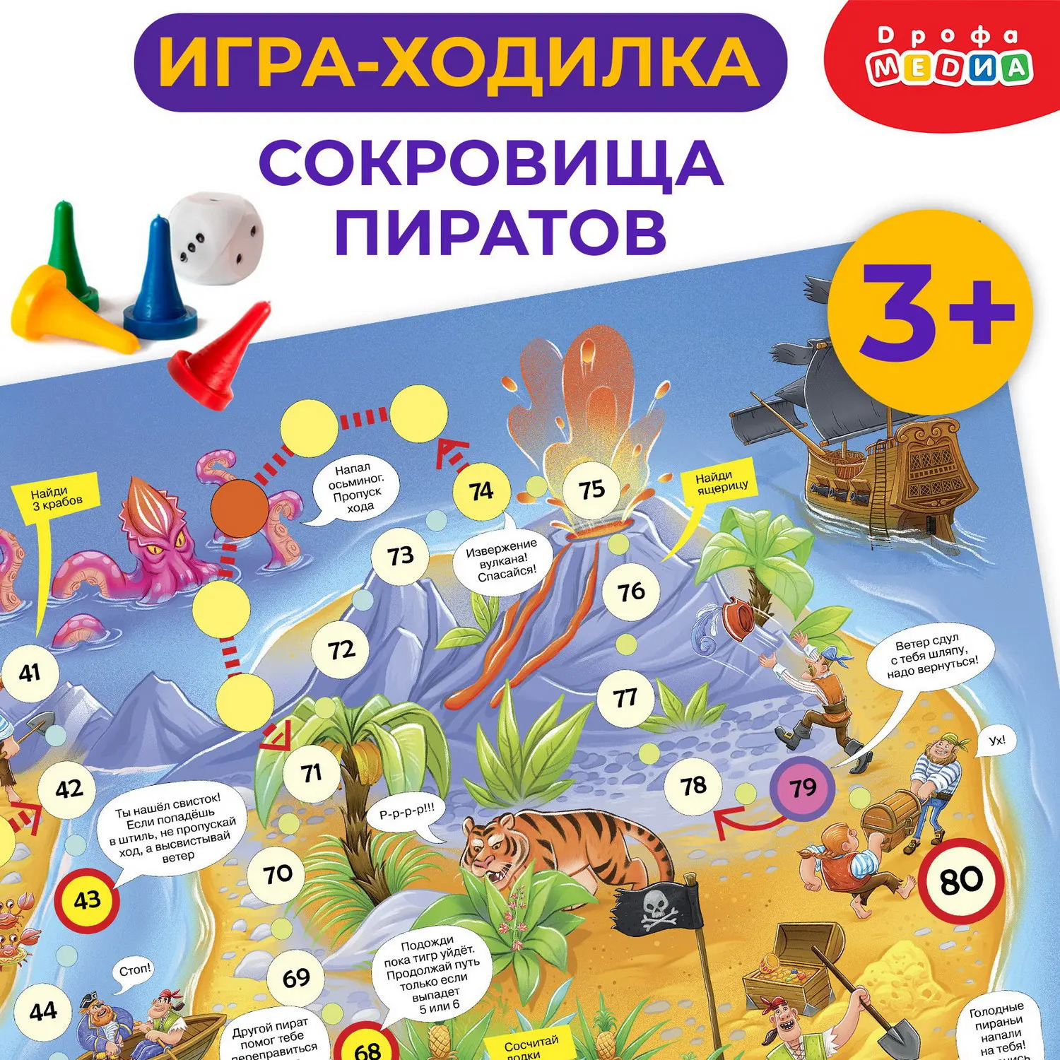 В комплекте: игровое поле, 4 фишки, кубик, правила.