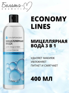 Белита-М Economy Lines Мицеллярная вода для лица и век с аллантоином для чувствительной кожи 400млSoft gentle 1. Бережно удаляет макияж 2. Увлажняет и успокаивает 3. Ускоряет регенерацию