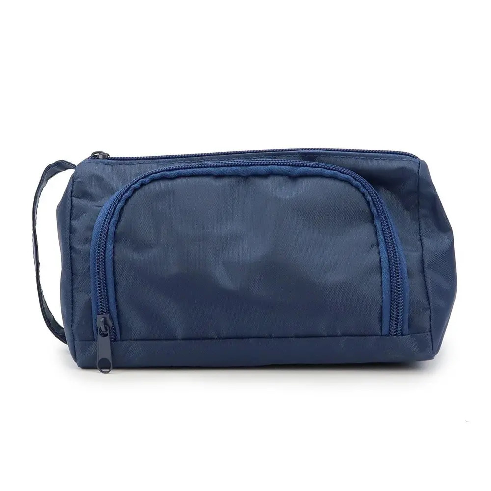 Многофункциональная классическая синяя косметичка довольно вместительна, благодаря своим размерам - 20*8*11 см и подойдёт для разных косметических принадлежностей, а также поместится в любую сумку или чемодан и не займёт в нём много места. Материал - 100% полиэстер. Девочки будут от неё в восторге!