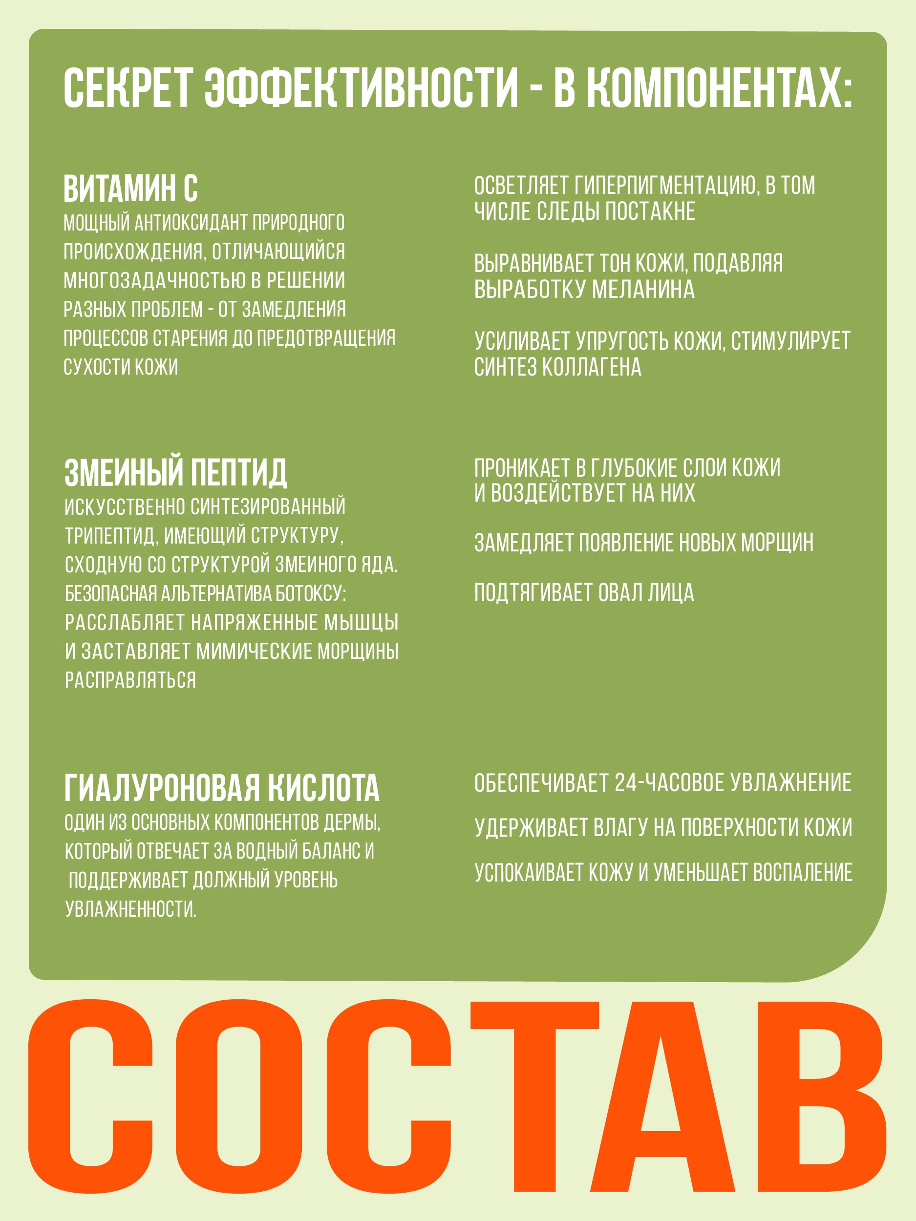 Сотри следы усталости с одного применения! Насыщенная витамином С, сыворотка обладает осветляющим эффектом и выравнивает тон. Гиалуроновая кислота, экстракты папайи и гуавы интенсивно увлажняют кожу, а пептиды стимулируют выработку коллагена и эластина.