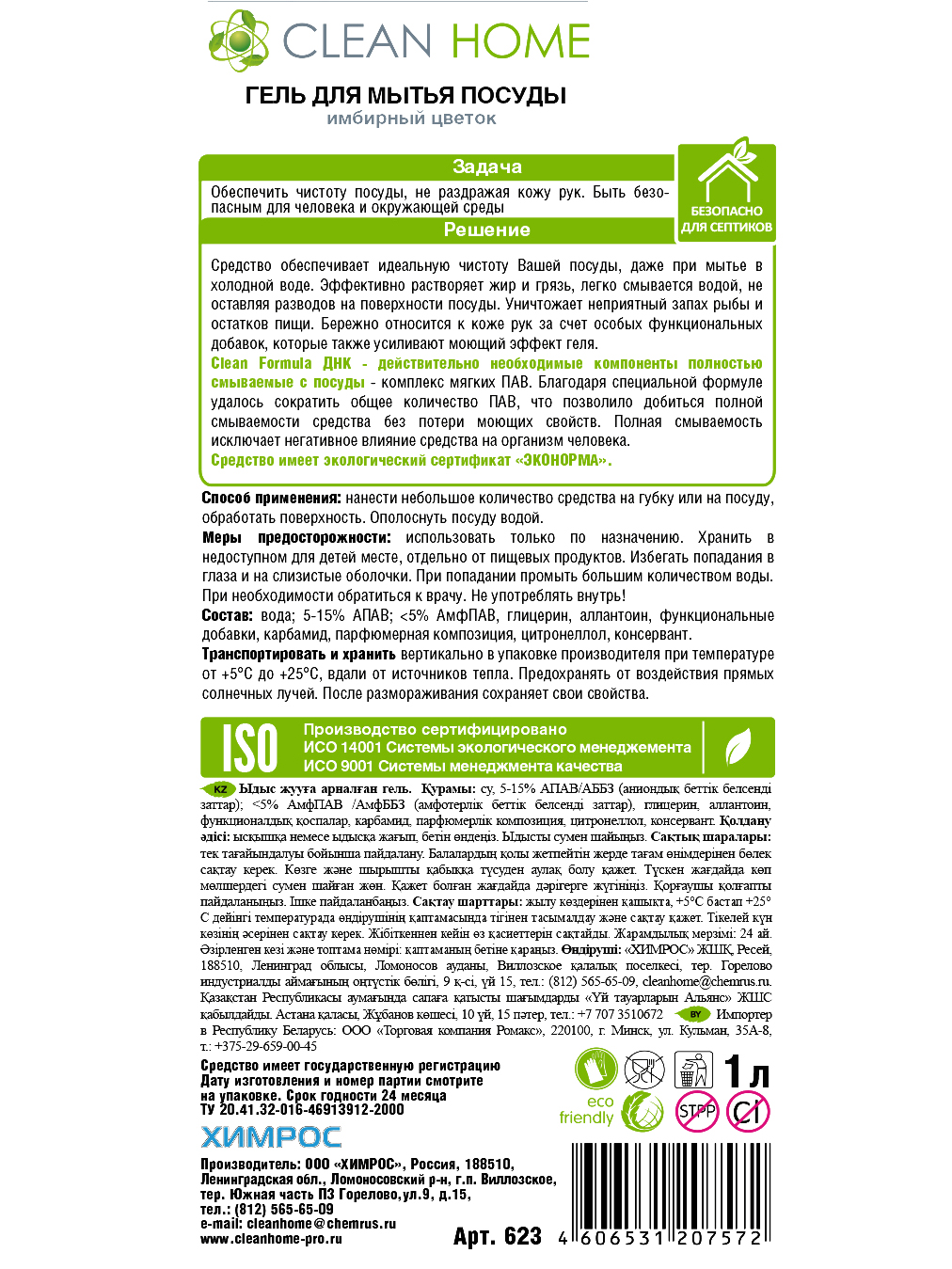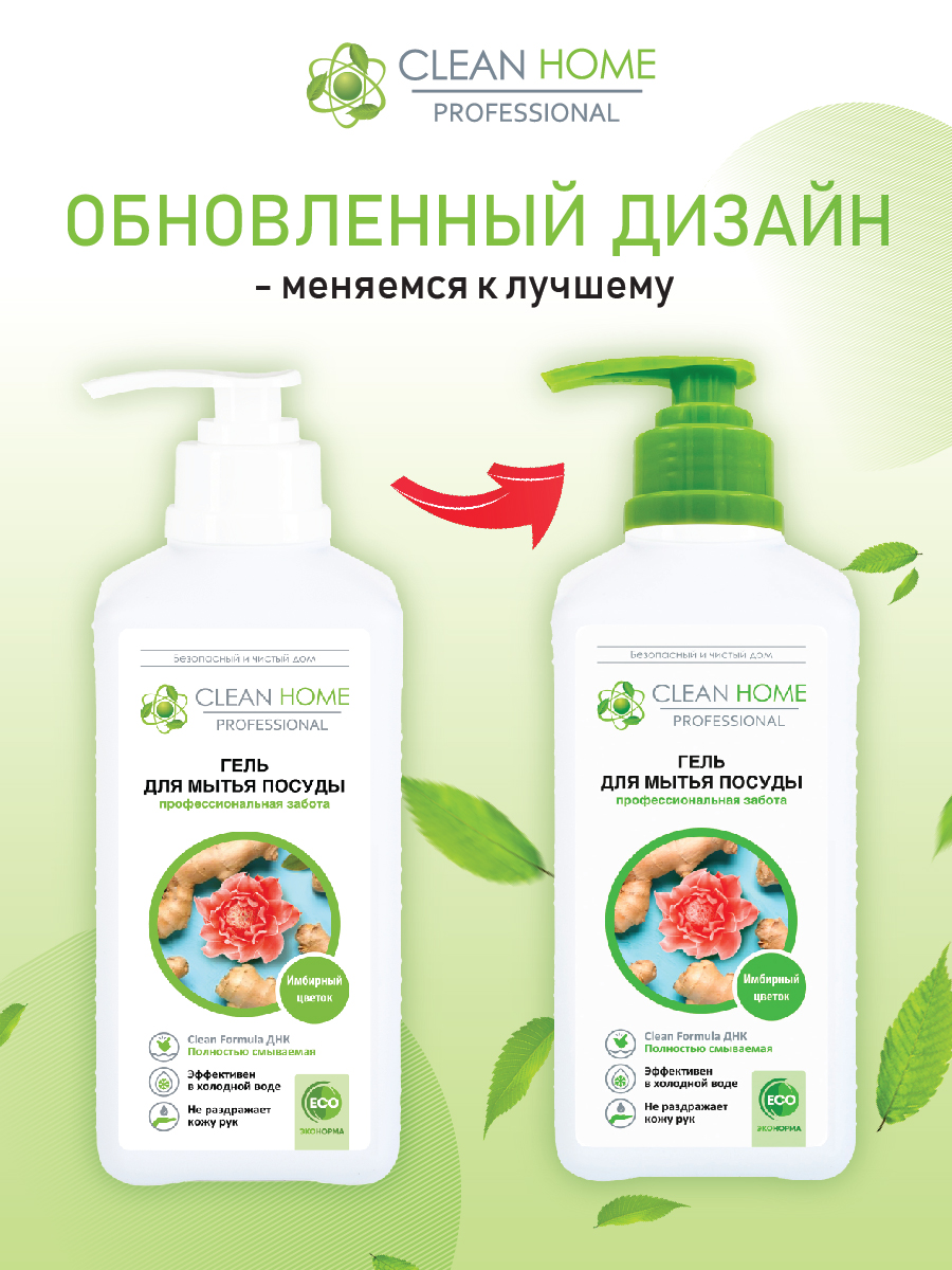 CLEAN HOME Гель для мытья посуды Имбирный цветок с дозатором 1л