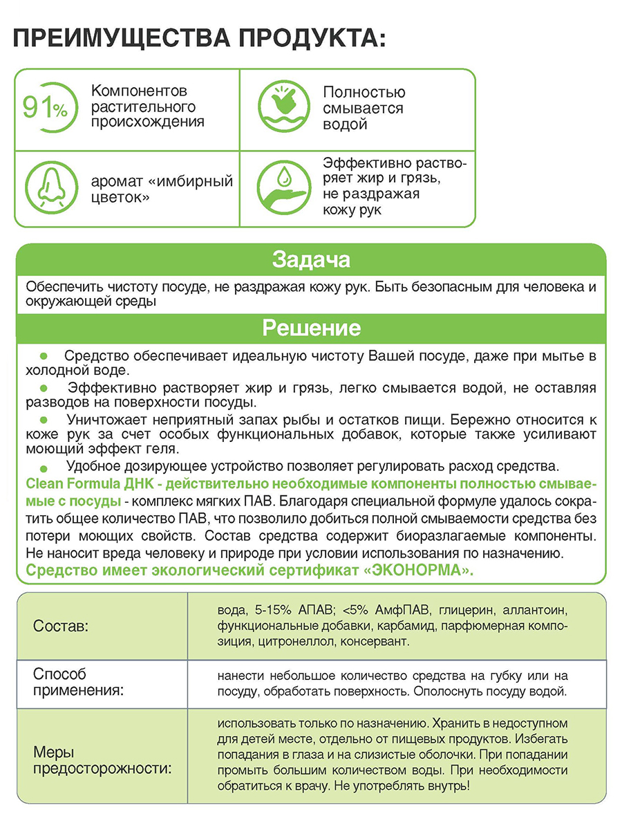 Средство обеспечивает идеальную чистоту Вашей посуде, даже при мытье в холодной воде. Эффективно растворяет жир и грязь, легко смывается водой, не оставляя разводов на поверхности посуды. Уничтожает неприятный запах рыбы и остатков пищи. Бережно относится к коже рук за счет особых функциональных добавок, которые также усиливают моющий эффект геля.Clean Formula ДНК - действительно необходимые компоненты полностью смываемые с посуды - комплекс мягких ПАВ. Благодаря специальной формуле удалось сократить общее количество ПАВ, что позволило добиться полной смываемости средства без потери моющих свойств. Полная смываемость исключает негативное влияние средства на организм человека.