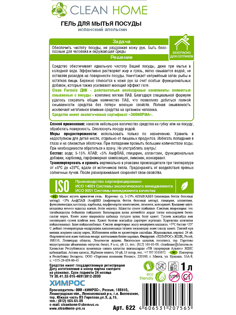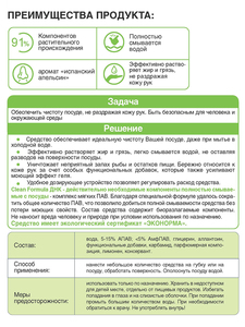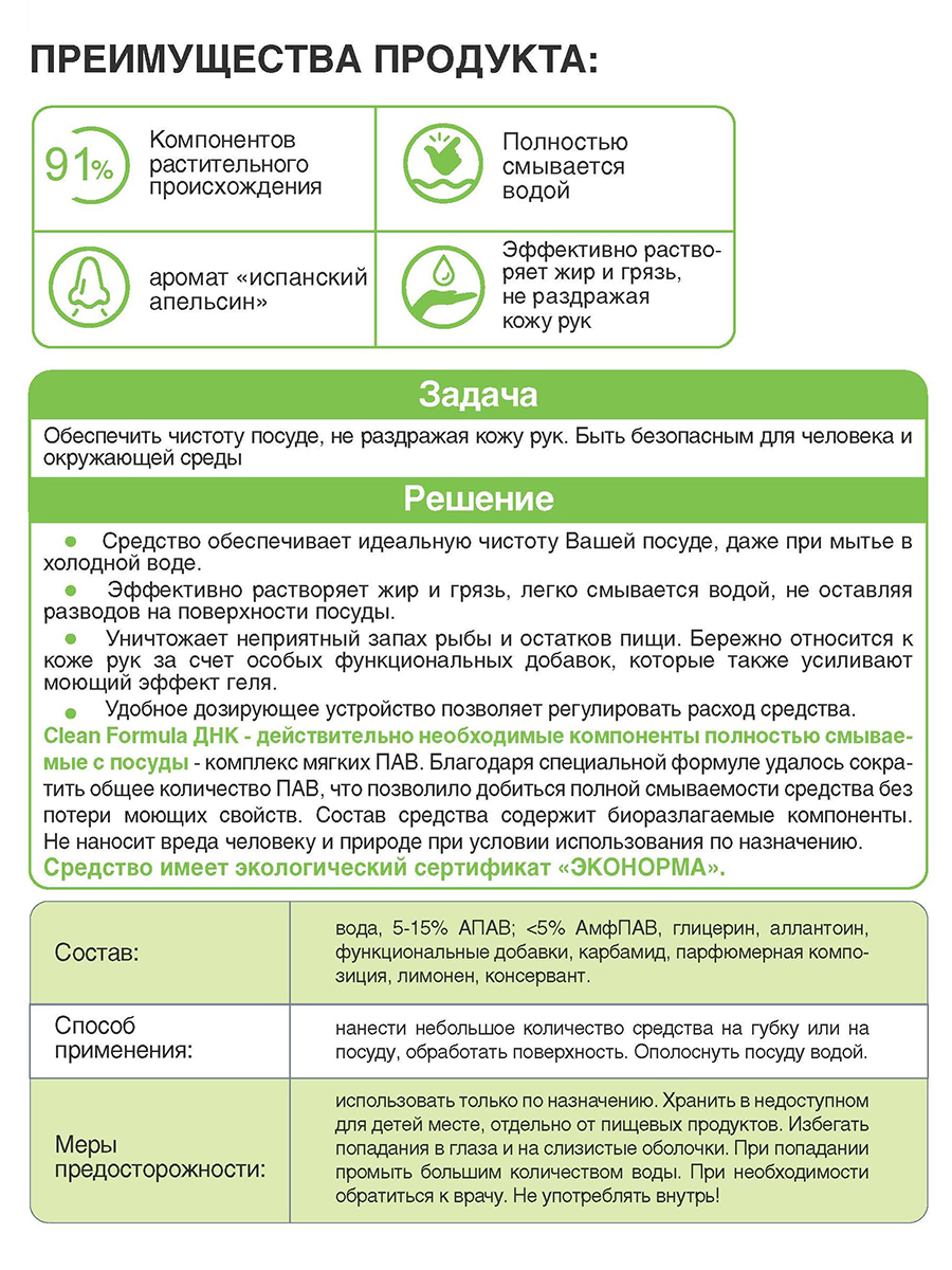 Средство обеспечивает идеальную чистоту Вашей посуде, даже при мытье в холодной воде. Эффективно растворяет жир и грязь, легко смывается водой, не оставляя разводов на поверхности посуды. Уничтожает неприятный запах рыбы и остатков пищи. Бережно относится к коже рук за счет особых функциональных добавок, которые также усиливают моющий эффект геля.Clean Formula ДНК - действительно необходимые компоненты полностью смываемые с посуды - комплекс мягких ПАВ. Благодаря специальной формуле удалось сократить общее количество ПАВ, что позволило добиться полной смываемости средства без потери моющих свойств. Полная смываемость исключает негативное влияние средства на организм человека.