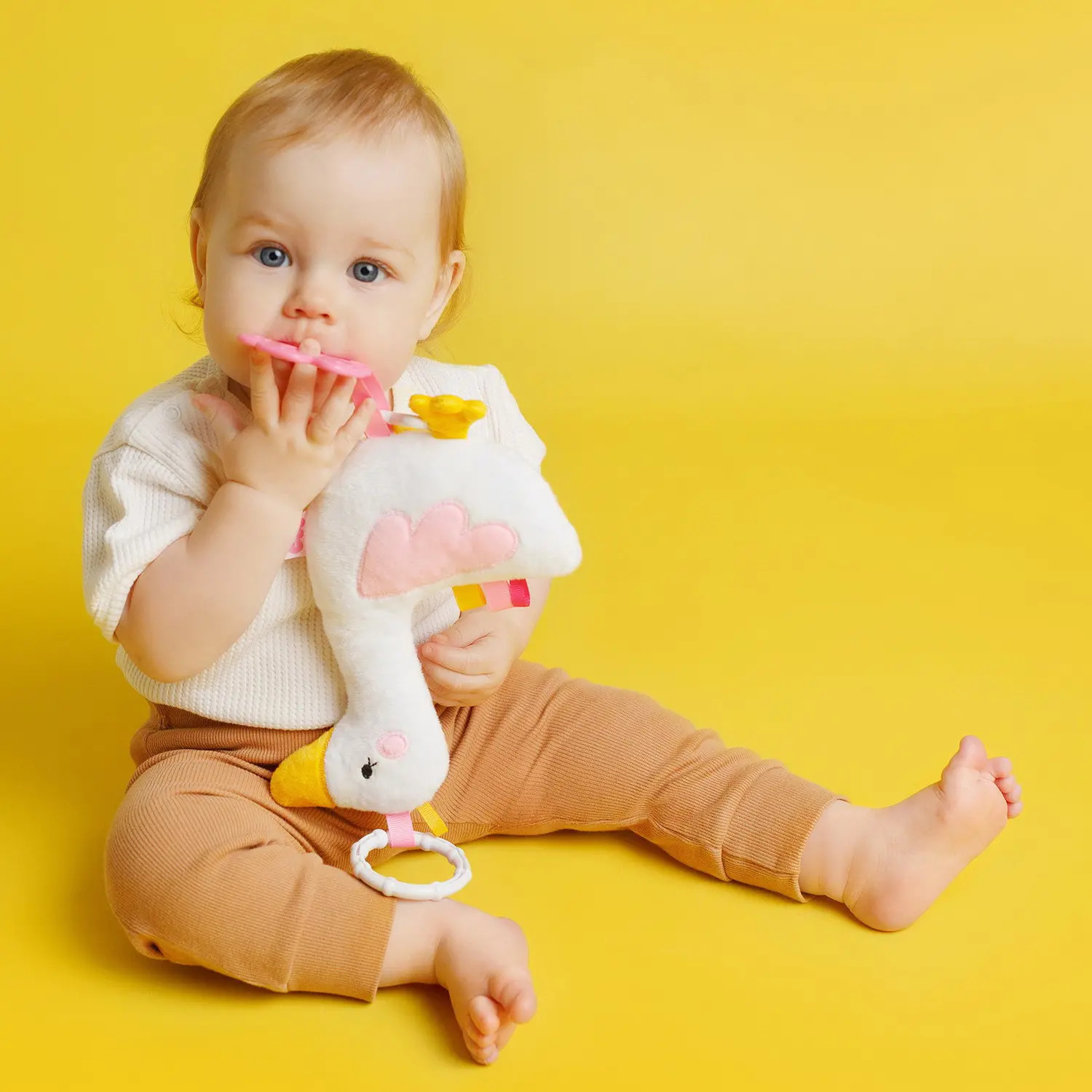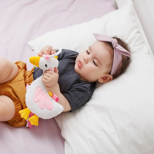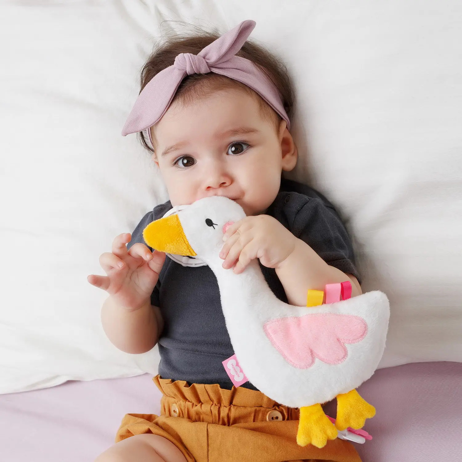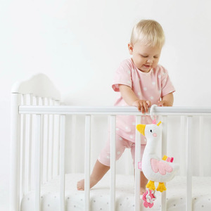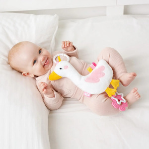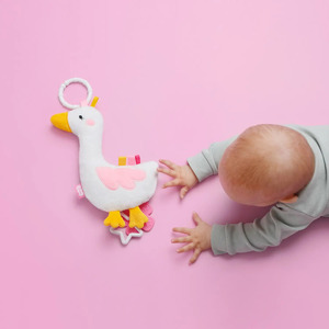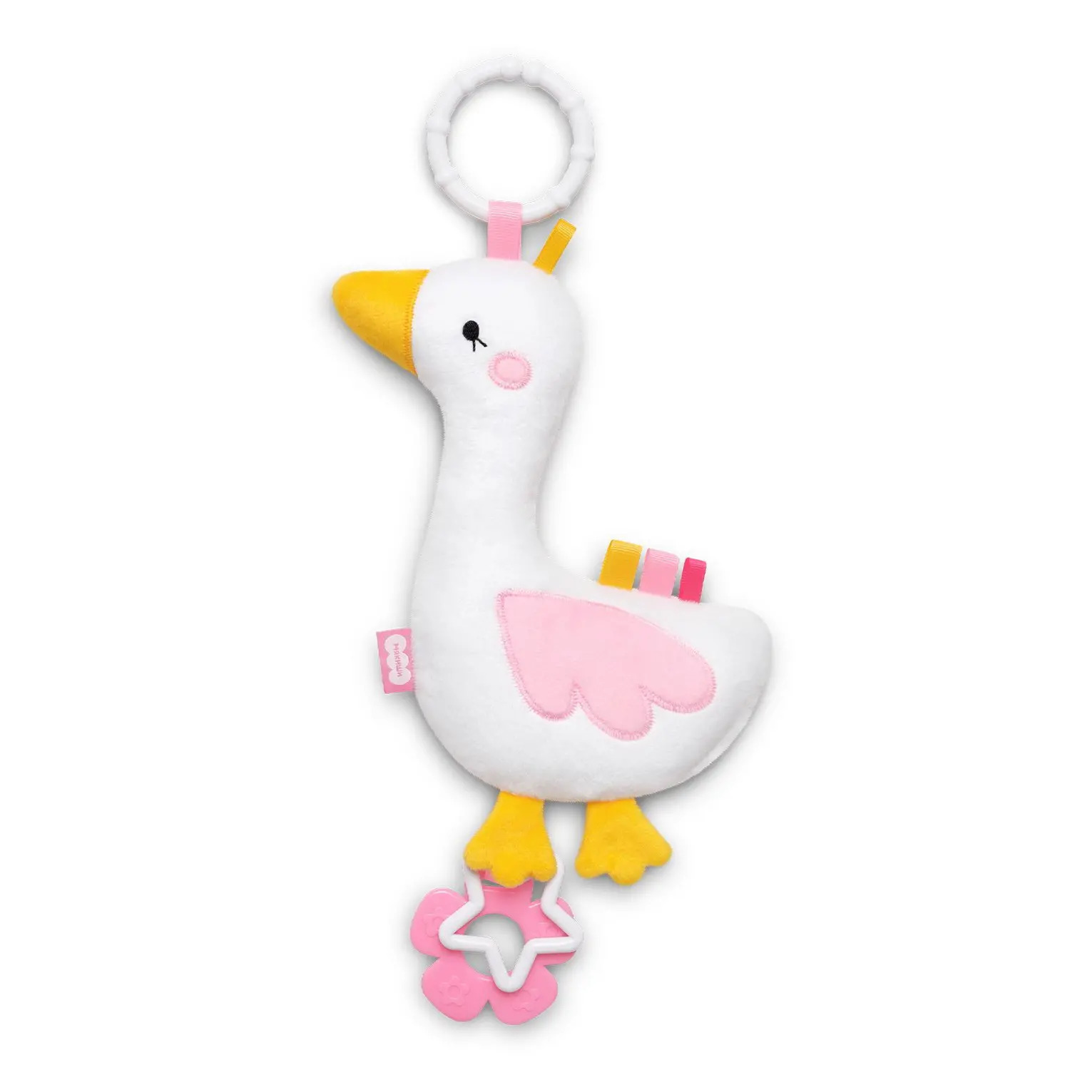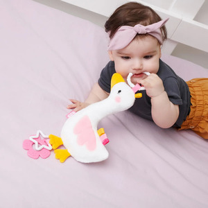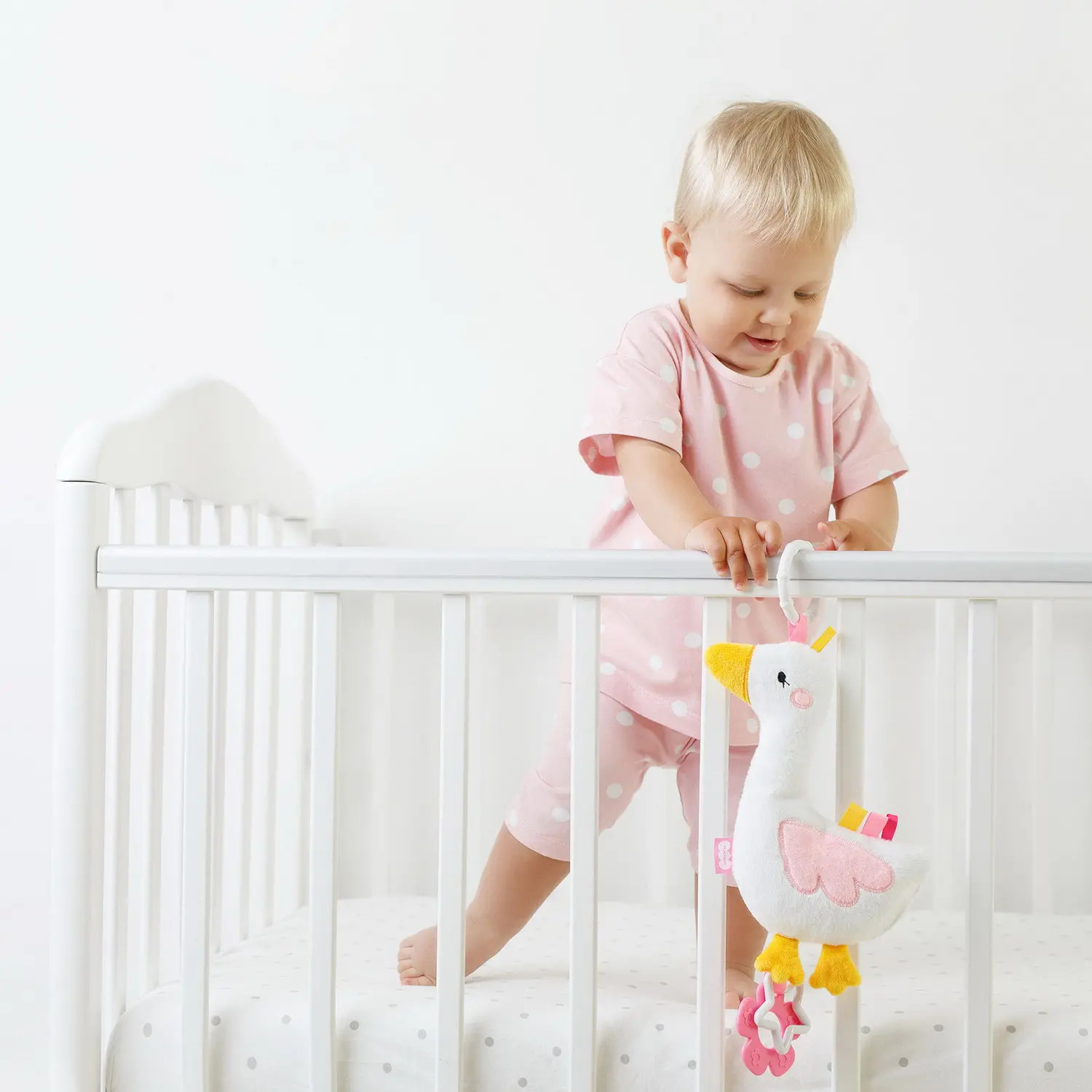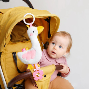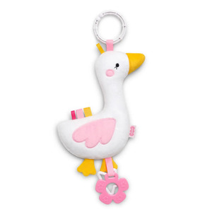 Занимательная мягкая развивающая игрушка подвеска хрустящий Гусь с петельками станет первой любимой вещью для малыша. Ваш кроха будет с удовольствием шуршать и изучать не только образ птицы, но и развивать тактильные ощущения, знакомясь с фактурой тканевых материалов, ведь это еще и шуршащая мягкая игрушка. Занятия с ярким фигурным предметом - как развивашки для детей - способствуют более раннему развитию мозга, остроты зрения и способности фокусироваться на предметах, развивает внимание, поле зрения, улучшает цветовосприятие и даже успокаивает ребенка в периоды перевозбуждения. Особенный интерес представляет грызунок-прорезыватель - его приятно погрызть, или просто потрогать пальчиками. Грызунок отлично снимает зуд при прорезывании зубов. Благодаря разъемному колечку погремушку удобно повесить на коляску, автокресло, кроватку. Многофункциональная игрушка антистресс развивает зрение и слух, воображение малыша, тактильность и надолго концентрирует его внимание. Гусь полностью симметричен, приятен для прикосновений и для визуального восприятия. Изготовлена из ярких безопасных материалов, что дает возможность использовать игрушку для малышей от 0+. Есть необходимые сертификаты, в том числе сертификат гипоаллергенности. Легко стирать. Такая мягкая подвеска долго прослужит Вашему малышу и поможет развивать многие навыки. Идеально подойдет в качестве подарка новорожденному, маленькой принцессе, на рождение дочери, на выписку из роддома или крестины; хороший подарок для девочки. Незаменимый аксессуар для новорожденных и для детей до года. Самостоятельное использование только с 1 года. Сделано в России.