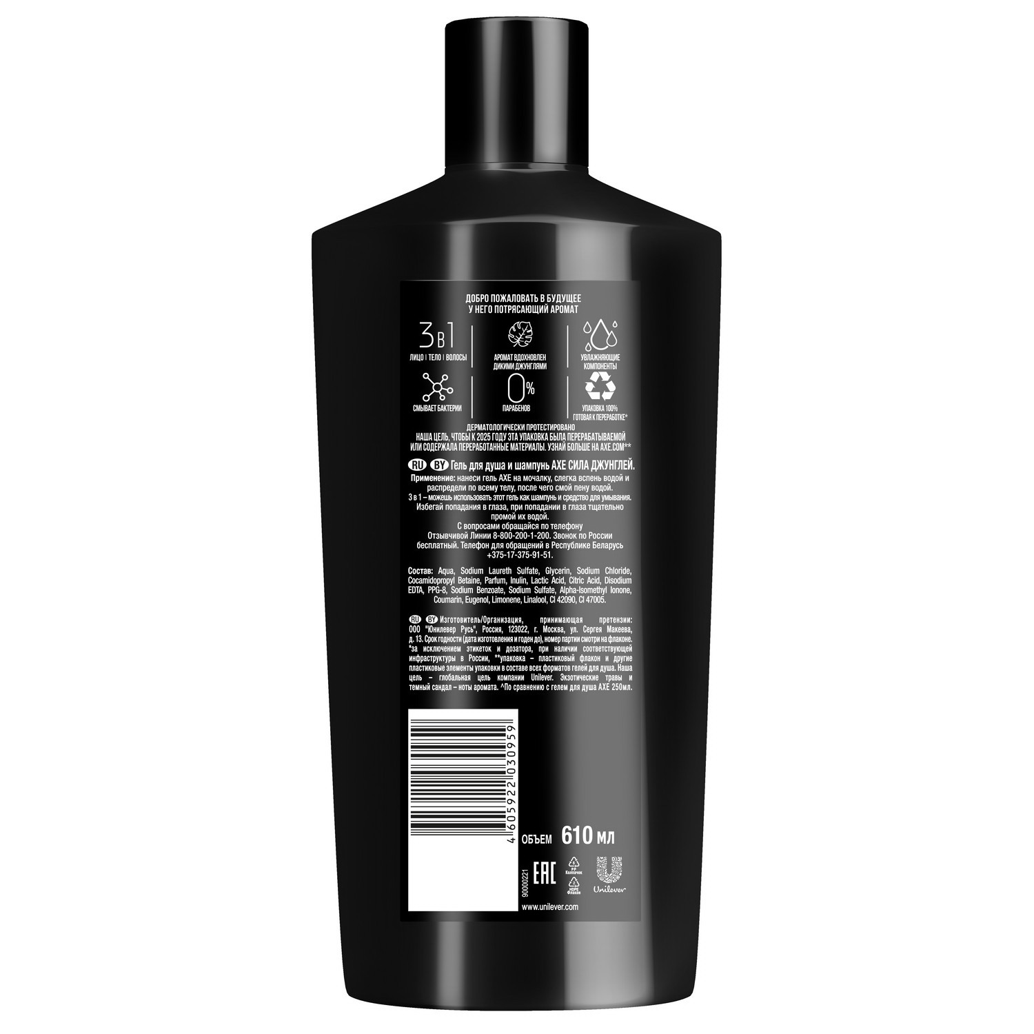 Мужской шампунь и гель для душа Акс XXL (610 мл) содержит на 144% больше продукта по сравнению со средством от Акс 250 мл. Так что, геля для очищения лица Сила джунглей тебе хватит надолго. Для максимального эффекта дополни шампунь парфюмированный мужской дезодорантом от бренда Акс.