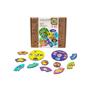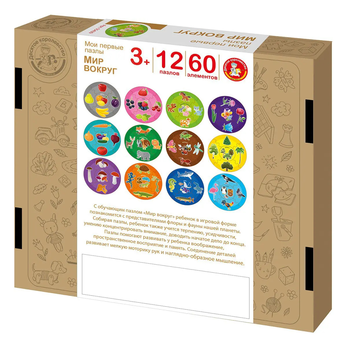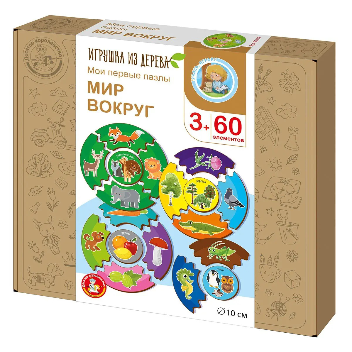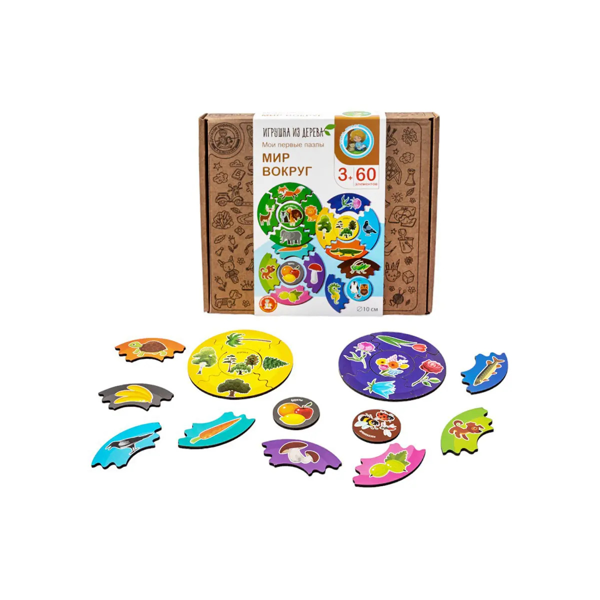 Пазлы из дерева. Мои первые пазлы "Мир вокруг" 60 эл Состав игры: 12 пазлов из древесного материала из 5 элементов каждый.Диаметр собранного пазла 10 см.