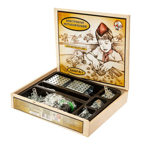 Деревянная коробка позволит сохранить все детали в целостности и сохранности, а пионер на обложке, наверняка, спровоцирует бабушку или дедушку на мастер-класс по сборке металлических конструкторов