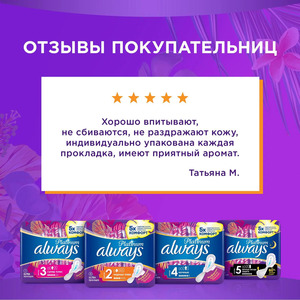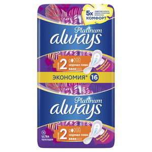 Гигиенические прокладки Always Platinum обеспечивают лучшее сочетание комфорта и защиты среди прокладок Always. Always Platinum более комфортны (по сравнению с Always Ultra) благодаря тысячам микроподушечек и новым, мягким как шелк крылышкам. Они также обеспечивают лучшую защиту (по сравнению с Always Ultra) благодаря защитным боковым барьерам и ультравпитывающему внутреннему слою, который запирает влагу внутри. Always Platinum «Нормал» Плюс (Размер 2) с крылышками рекомендованы для дневного использования при скудных и умеренных выделениях.
