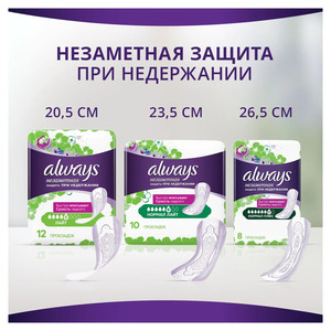 Прокладки Always Незаметная защита при недержании «Нормал» Лайт, 10 шт. Для тех моментов, когда вам необходима дополнительная защита, есть прокладки Always «Незаметная защита при недержании». Они впитывают в 3 раза больше жидкости, чем обычные ежедневные прокладки*, и надолго сохраняют сухость. Кроме того, они оснащены технологией нейтрализации запаха, которая дарит непревзойденную свежесть и обеспечивает чувство уверенности. Попробуйте прокладки Always «Незаметная защита» для защиты при недержании. *по сравнению с самыми популярными ежедневными прокладками в России- Быстро впитывает. Сухость надолго — ультравпитывающий внутренний слой превращает жидкость в гель и удерживает его внутри