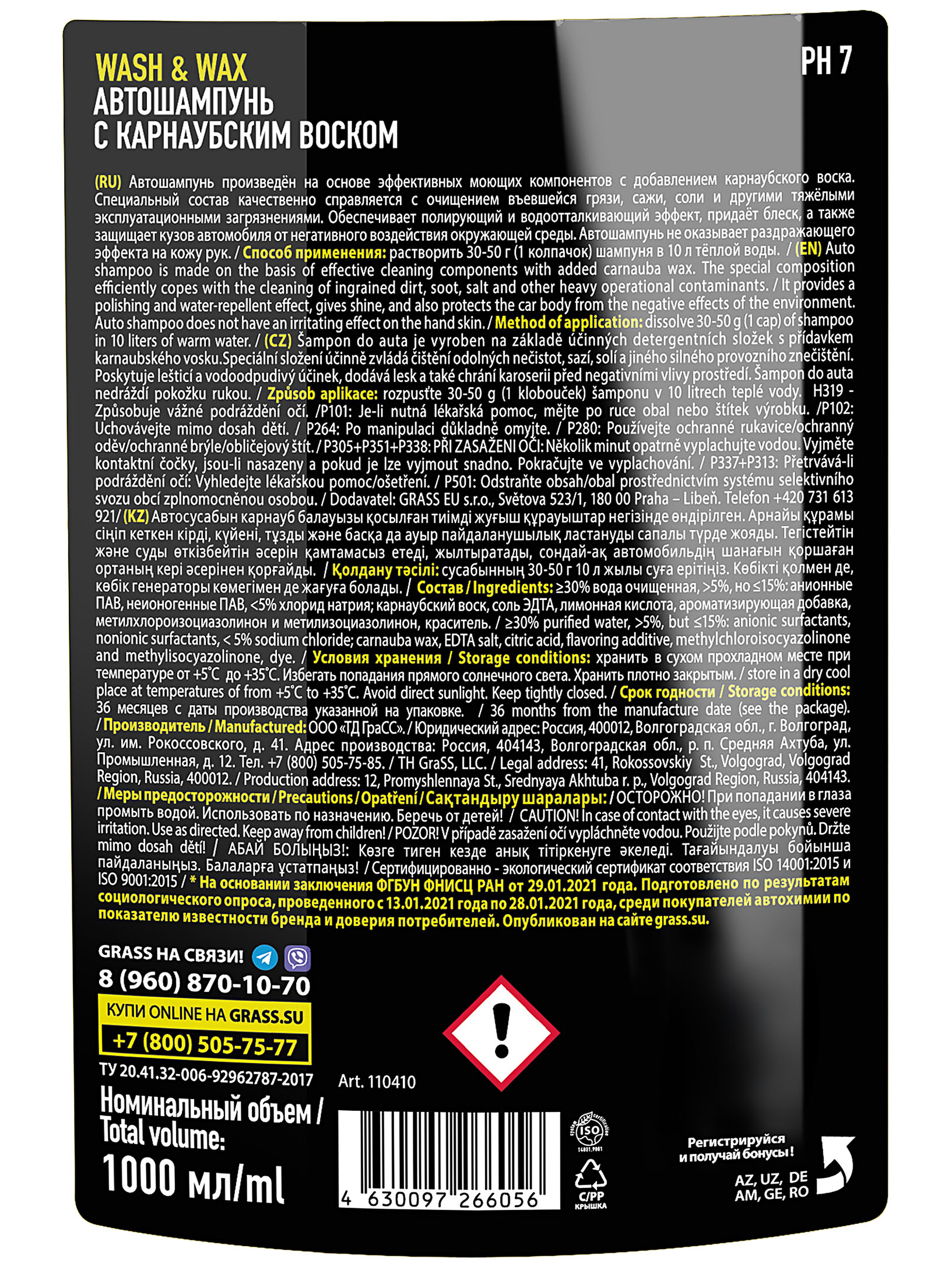 Grass Автошампунь с карнаубским воском Wash & Wax 1л