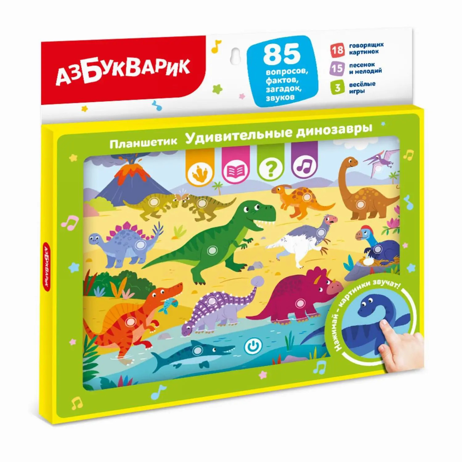 Динозавры оживают в новом планшетике от Азбукварика «Удивительные динозавры»! Все картинки – говорящие! Нажимая на них, ребенок познакомится тираннозавром, трицератопсом, птеродактилем, брахиозавром и другими невероятными ящерами! Кроме того, ребенок сможет послушать их голоса, познавательные песенки про каждого динозавра и интересные факты!Для проверки знаний в планшетике есть 3 игры: «Искалочка», «Динозаврия», «Загадки динозавров». Обучение через игру – это эффективный, инновационный и современный подход! Всего в игрушке 85 вопросов, фактов, загадок, звуков.
