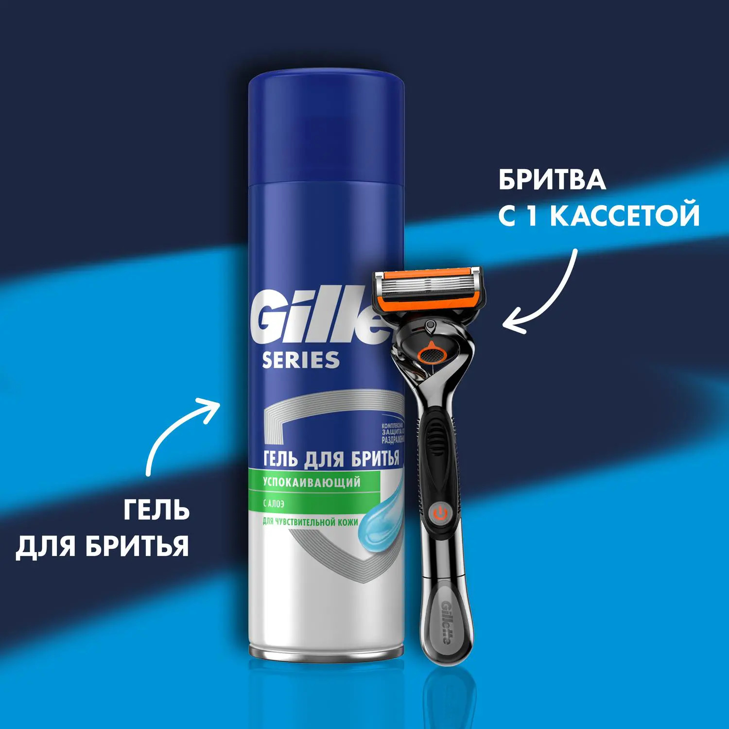 Комплектация: многоразовый бритвенный станок Fusion5 ProGlide 1 шт., 1 кассета (надета на станок), гель для бритья Gillette Series Увлажняющий 200мл.