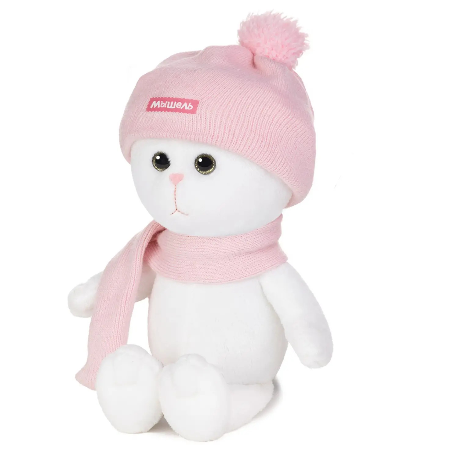 Белоснежная кошечка Мышель готова к зимним развлечениям. Теплый комплект из шапочки и шарфика нежно-розового цвета идеально подчеркивает ее нежную натуру и не дает потеряться в снежных сугробах.