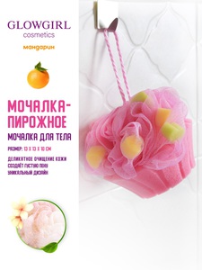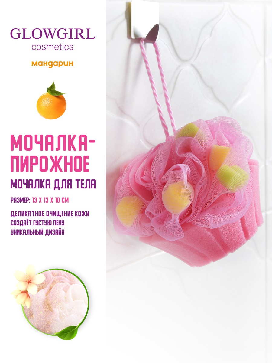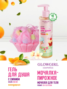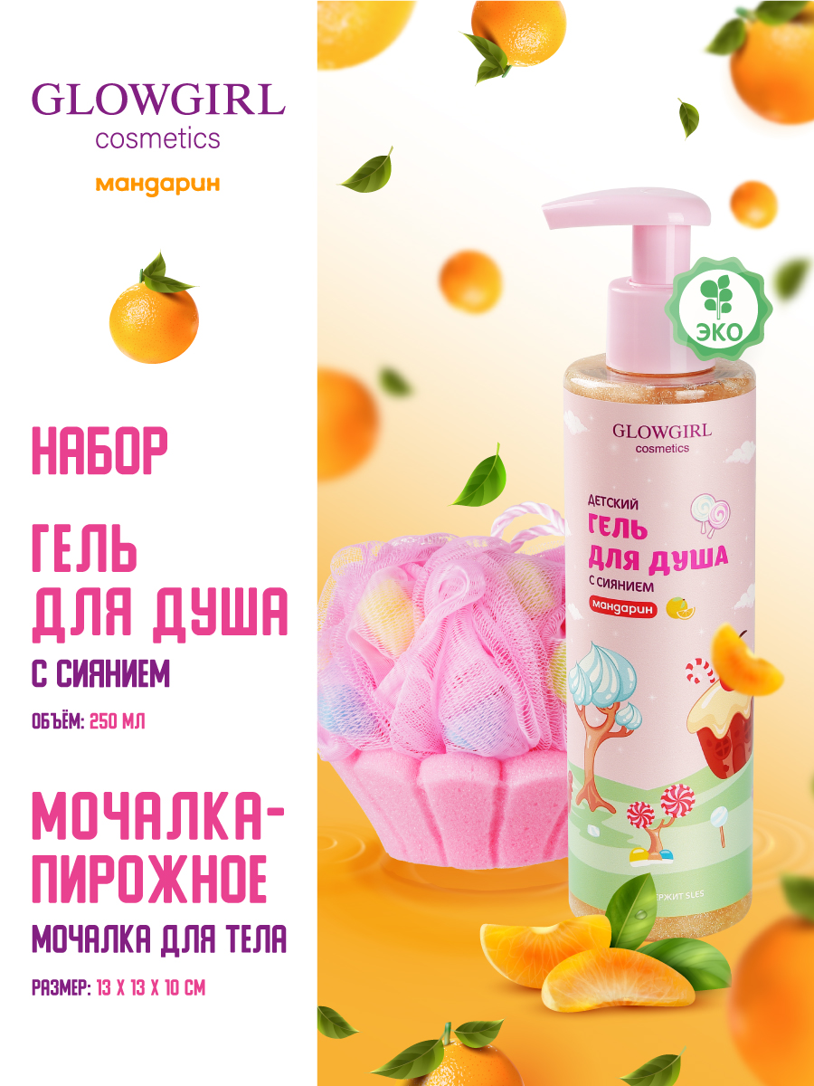 Подарочный набор косметики Glowgirl cosmetics детский Гель для душа золотое сияние Мандарин ЭКО продукт + Мочалка для тела «Капкейк» нежно-розовая