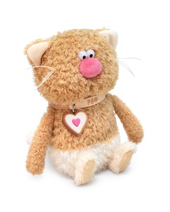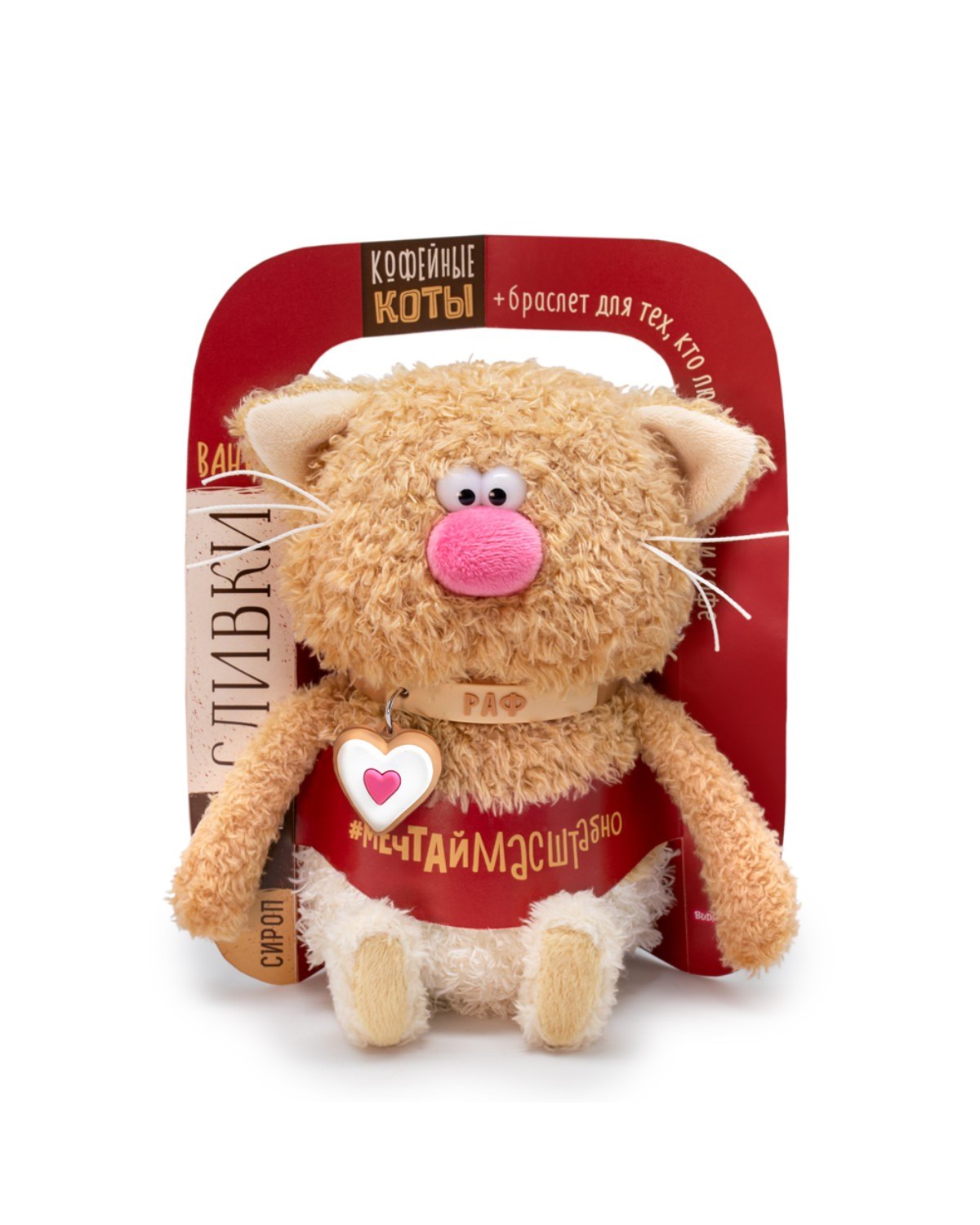 Очаровательный котик Раф из тактильно приятного эко меха в двух оттенках, цвета песочного печенья и цвета топленого молока. Лапки и хвостик из более короткого меха. Усики из шелковистого крученого шнура. Объемный носик обтянут розовым софтом. Глазки из пластика. Пяточки из софта цвета крема, а внутри ушек софт сливочного цвета. На шейке у котика силиконовый чокер с именем и подвесом в виде печенья в форме сердечка с белым кремом сверху и розовым сердечком в середине. Чокер легко снимается и может послужить в качестве модного браслета для друга.