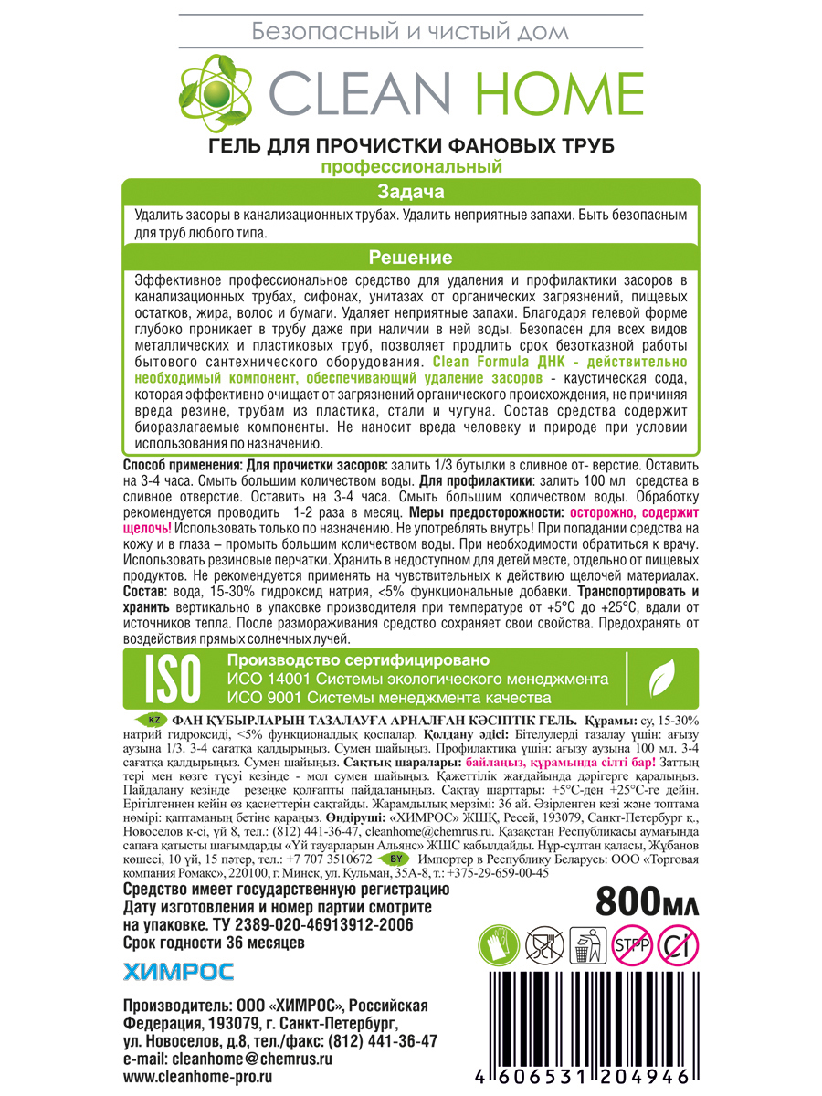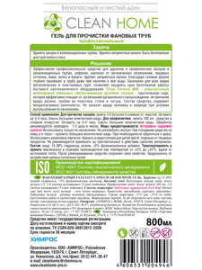 CLEAN HOME Гель для прочистки труб 800мл КОНЦЕНТРАТ