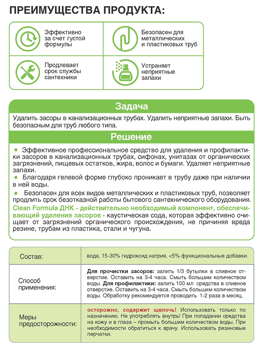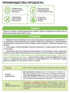 Эффективно удаляет неприятные запахи. Благодаря гелевой форме глубоко проникает в трубу даже при наличии в ней воды. Безопасно для всех видов металлических и пластиковых труб, позволяет продлить срок безотказной работы бытового сантехнического оборудования.