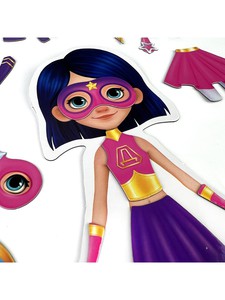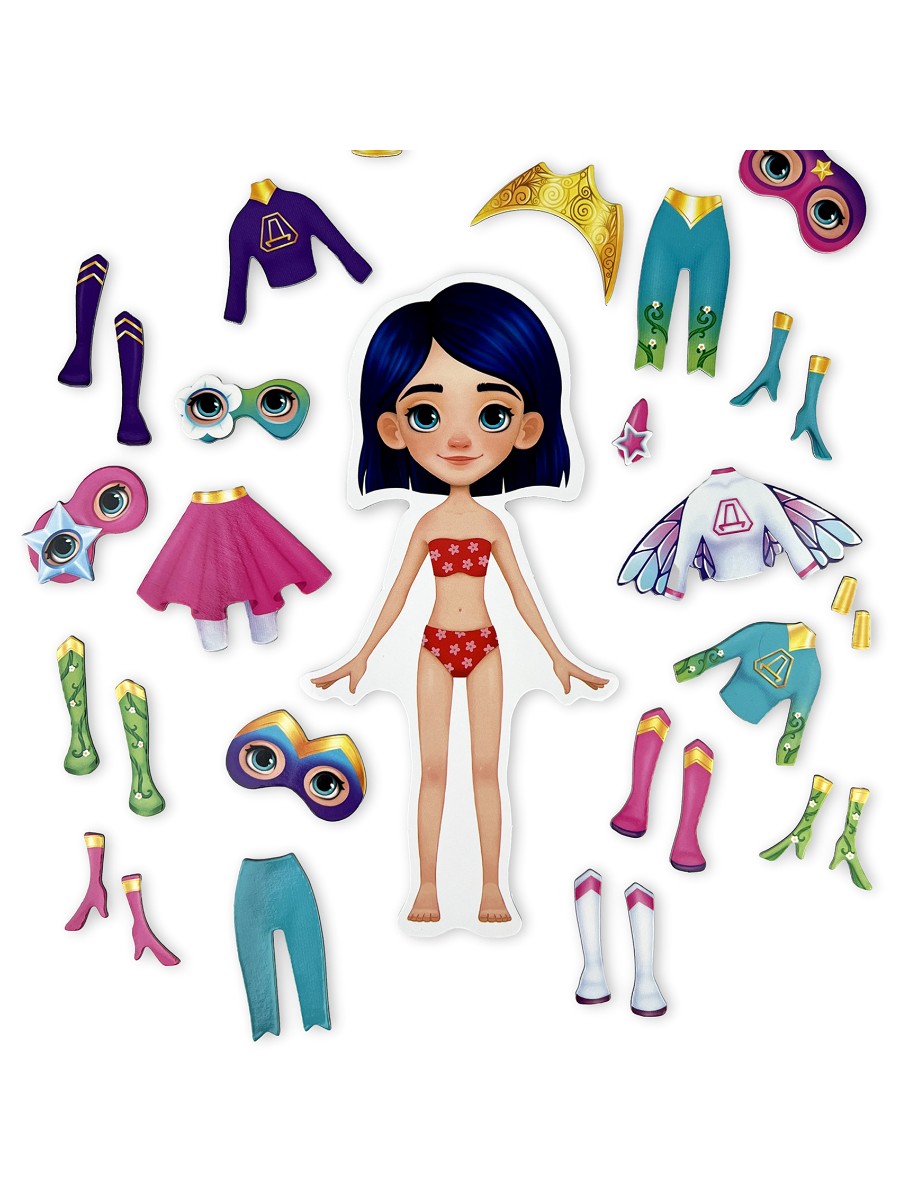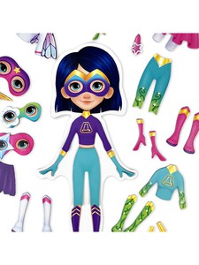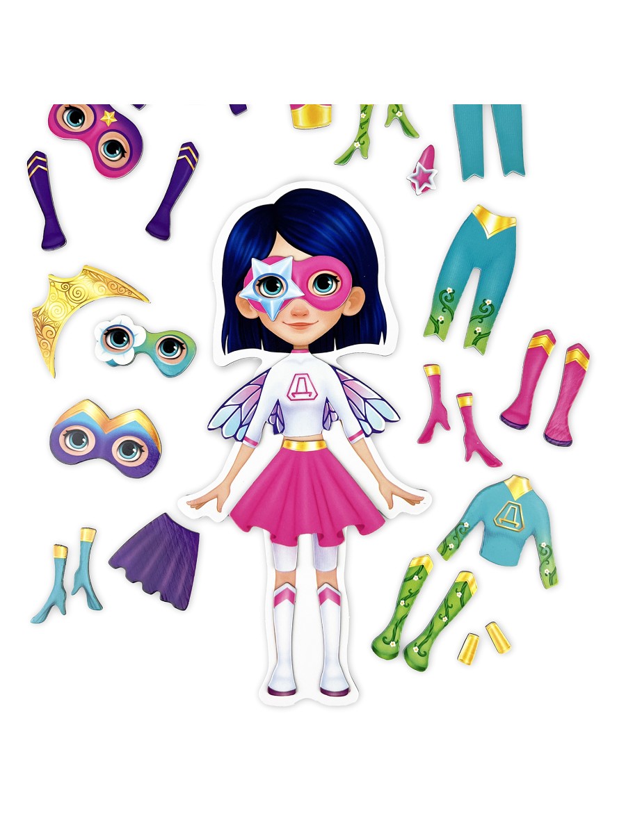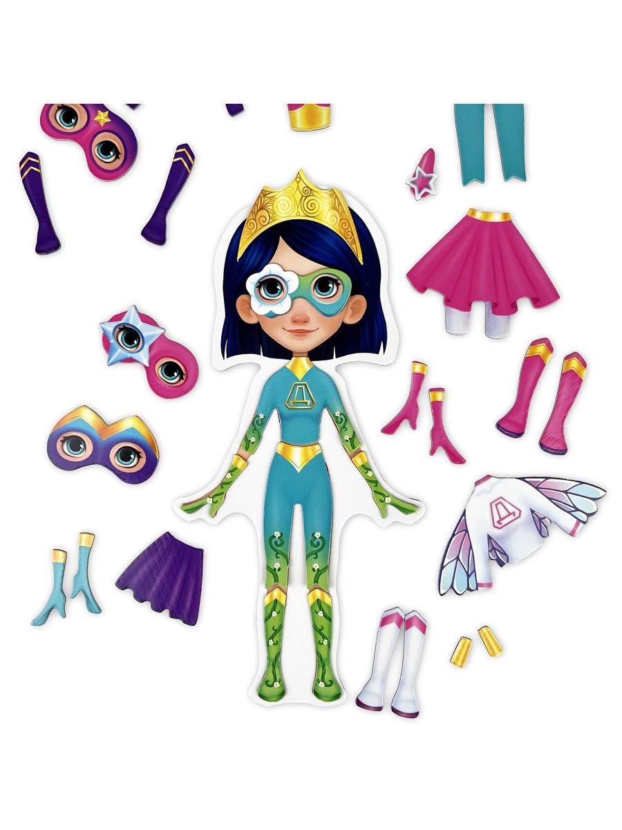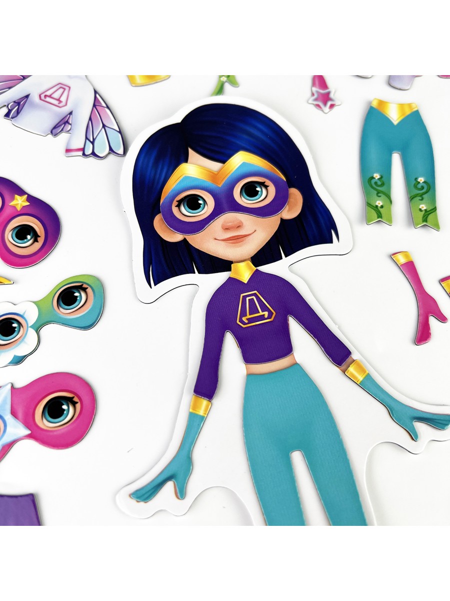 Игровой набор для девочек с магнитной куколкой и одеждой для неё поможет любой девочке почувствовать себя супергероиней! В комплекте есть всё для создания супергеройского образа – костюмы, маски и разнообразные аксессуары.Создавать супергеройские образы и менять их в соответствии с сюжетом игры легче лёгкого, потому что вся одежда и аксессуары для куклы с магнитной основой. Одежда хорошо держится на куколке, легко снимается и надевается. Сама куколка не крепится к металлическим объектам.