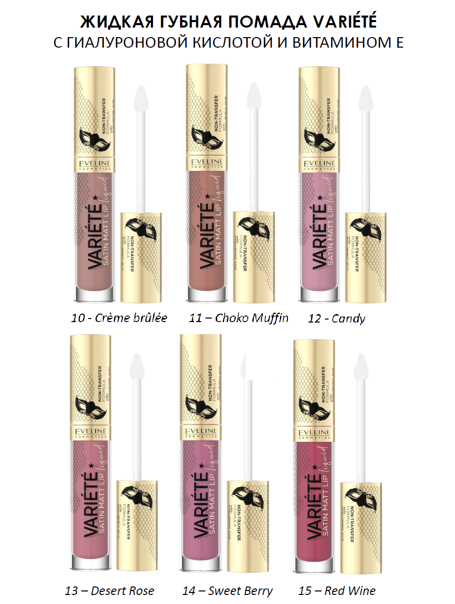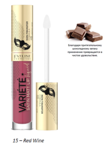 Жидкая помада из серии VARIETE с кремовой текстурой и матовым финишем легко наносится на губы, не растекается и не отпечатывается на маске. Содержащийся в формуле, уникальный увлажняющий и витаминный комплекс с гиалуроновой кислотой и витамином Е, заботится о состоянии нежной кожи губ, предотвращая их пересушивание. Помада держится на губах до 6 часов, а формула NONTRANSFER гарантирует, что цвет останется на губах, а не на других материалах. Приятный шоколадный аромат превращает нанесение в особый, чувственный ритуал