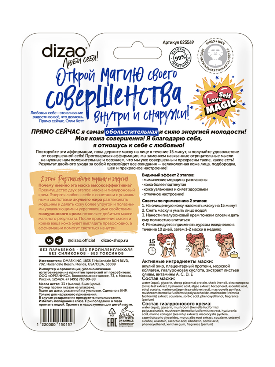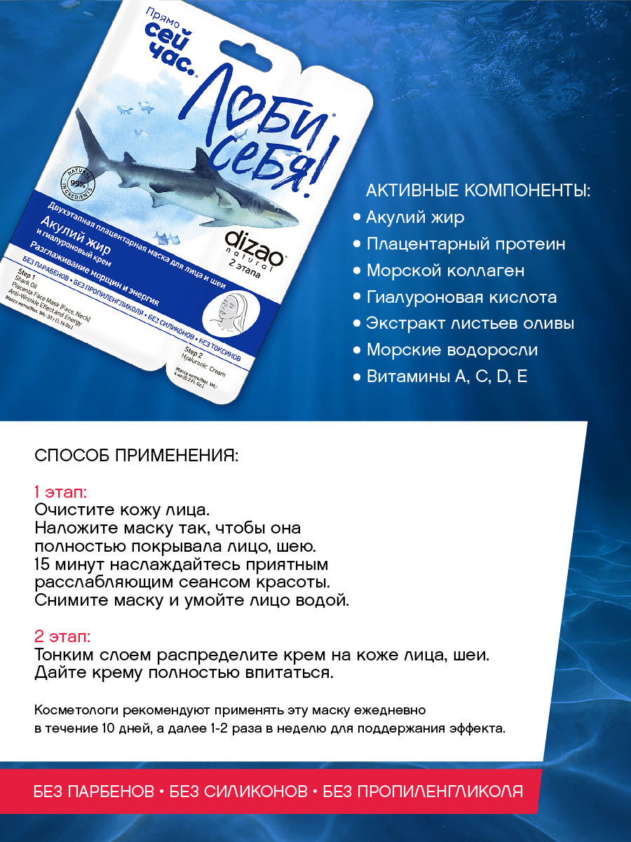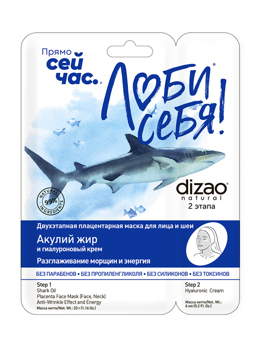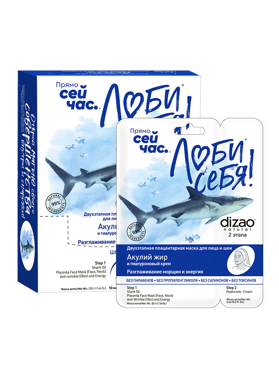 Классические маски Dizao Natural содержат 99,6% натуральных природных ингредиентов, а их эффект сравним с посещением косметического салона!Акулий жир много тысяч лет применяется в народной медицине, и высоко ценится косметологами. Его полезные свойства как нельзя лучше раскрылись в новой уходовой косметике Dizao. Двухэтапная плацентарная маска для лица и шеи «Акулий жир» с гиалуроновым кремом обладает качественным омолаживающим составом. Она заметно разглаживает морщины уже после первого применения. Акулий жир – основной действующий компонент питательной маски. Он способствует замедлению процессов старения, борется с отеками и мешками под глазами, питает и увлажняет. Ретинол, входящий в состав акульего жира, ускоряет процессы обновления клеток и укрепляет структуру кожи. Витамин Е – самое мощное омолаживающие средство, которое используется в косметологии, и он также содержится в акульем жире. Также в состав маски входит экстракт плаценты – еще один мощный омолаживающий компонент, т.к. его строение схоже со строением кожи человека, что многократно повышает омолаживающую эффективность средства.
