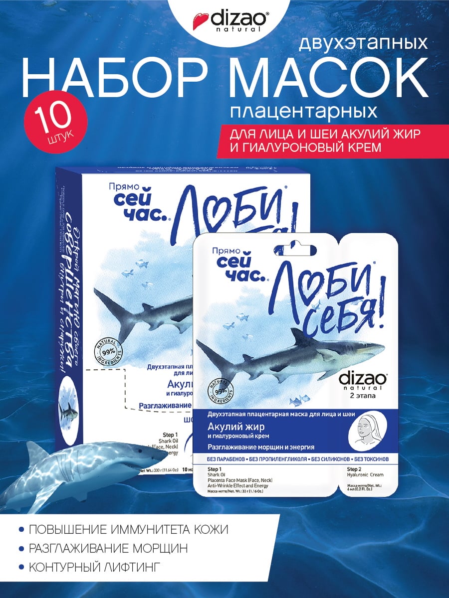 DIZAO Набор Маска двухэтапная плацентарная для лица и шеи Акулий жир и гиалуроновый крем, 10 штук