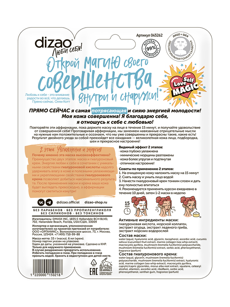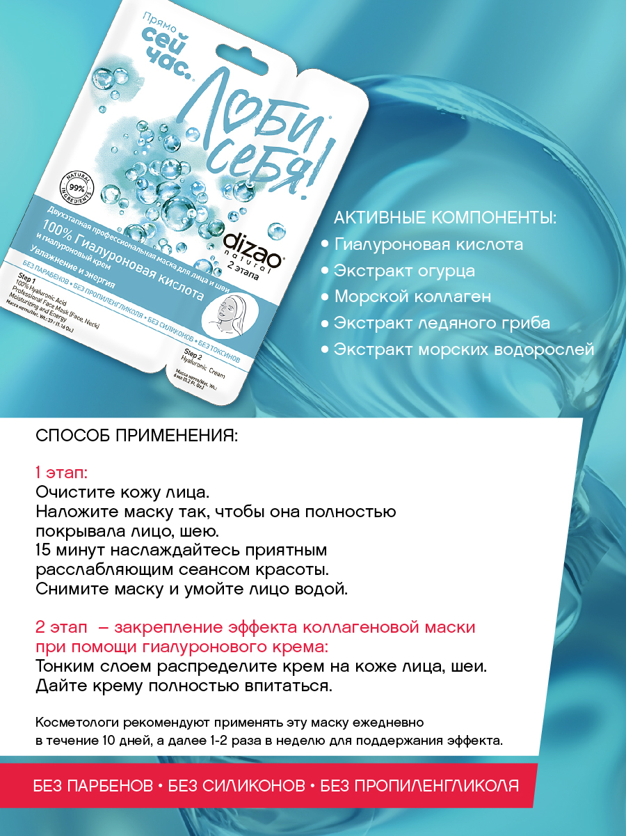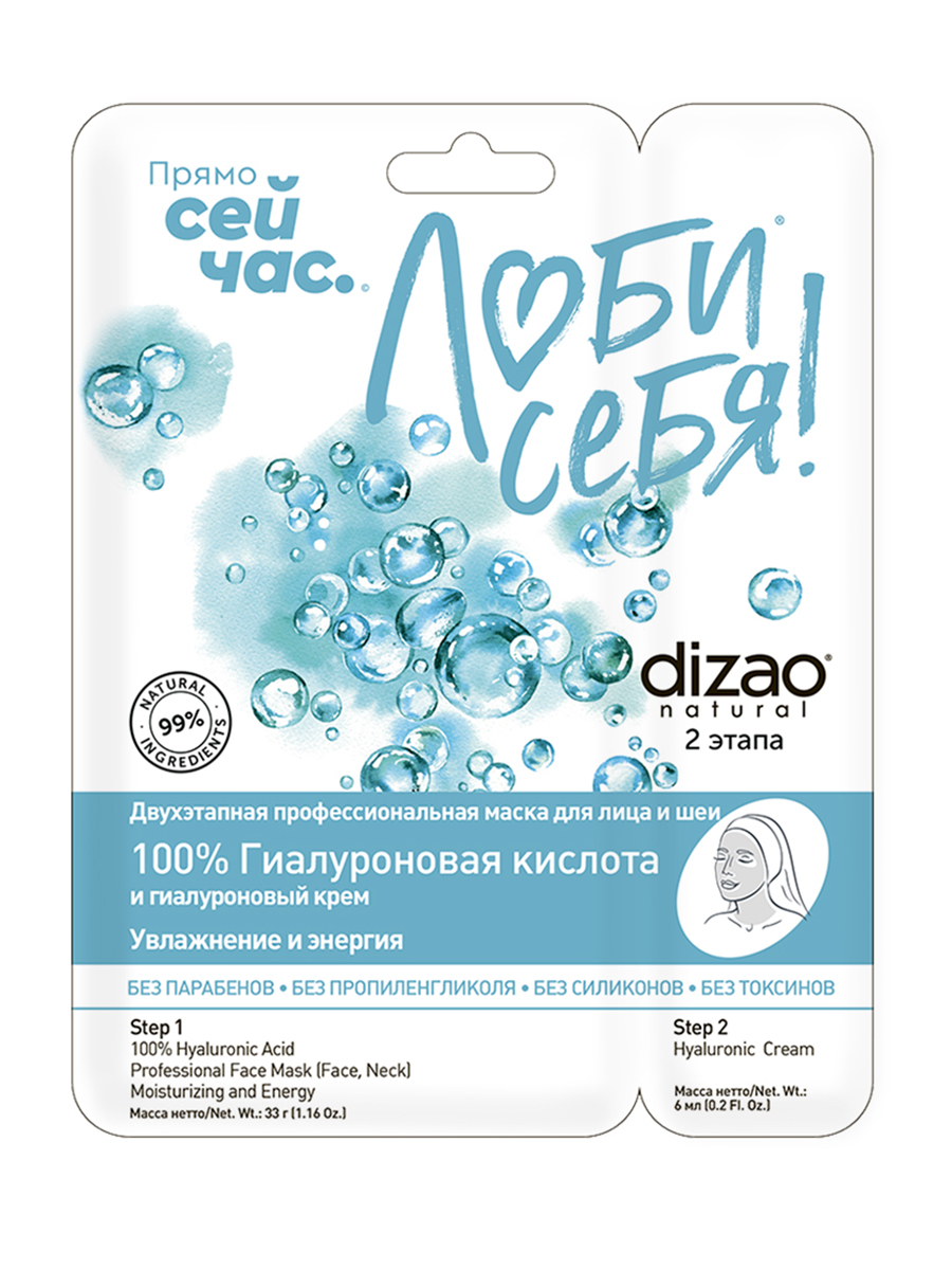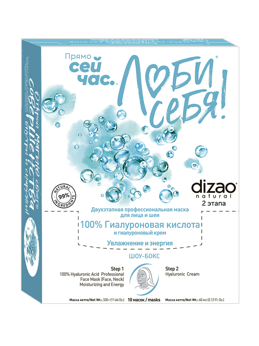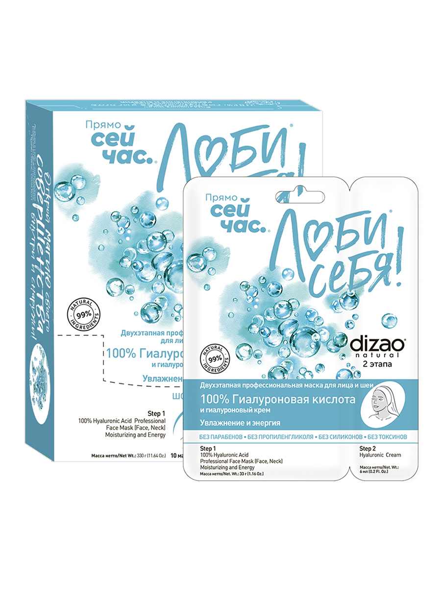 Маски для лица Dizao Natural содержат 99,6% натуральных природных ингредиентов.Обезвоженная кожа теряет упругость и привлекательность, быстрее стареет и нуждается в особом уходе. Двухэтапная маска «100% гиалуроновая кислота» с коллагеном от Dizao восстанавливает эластичность кожи и увлажняет ее на клеточном уровне. Гиалуроновый крем используется во втором этапе маски и фиксирует достигнутый эффект увлажнения. Гиалуроновая кислота является наполнителем волокон коллагена и эластина. В состав маски входят два вида гиалуроновой кислоты. Высокомолекулярная кислота стимулирует синтез коллагена, а низкомолекулярная кислота образует пленку на поверхности кожи и препятствует потере влаги. Двойное действие, усиленное другими активными составляющими крема, гарантирует эффект от применения маски.