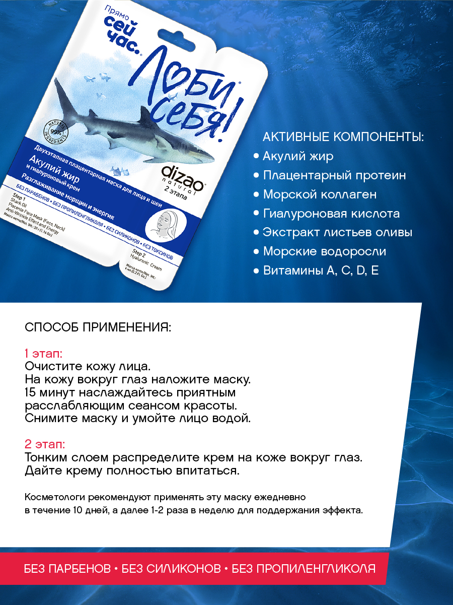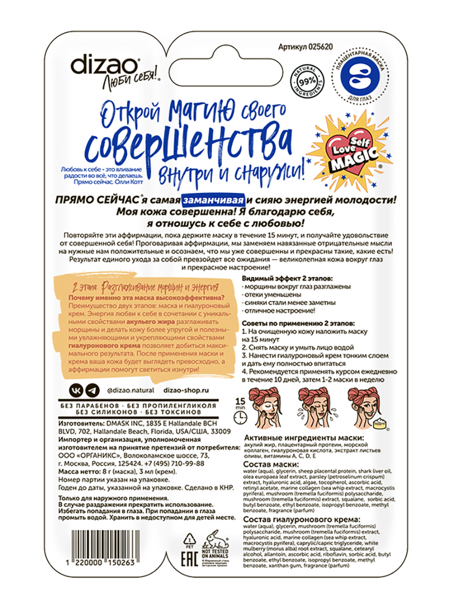 Классические маски-патчи для глаз Dizao Natural содержат 99,6% натуральных природных ингредиентов, а их эффект сравним с посещением косметического салона. Маски классической серии двухэтапные и содержат гиалуроновый крем с гиалуроновой кислотой, увлажняющие кожу и усиливающие эффект маски.1 этап: Плацентарная маска для глаз. От морщин, отеков и мешков под глазами