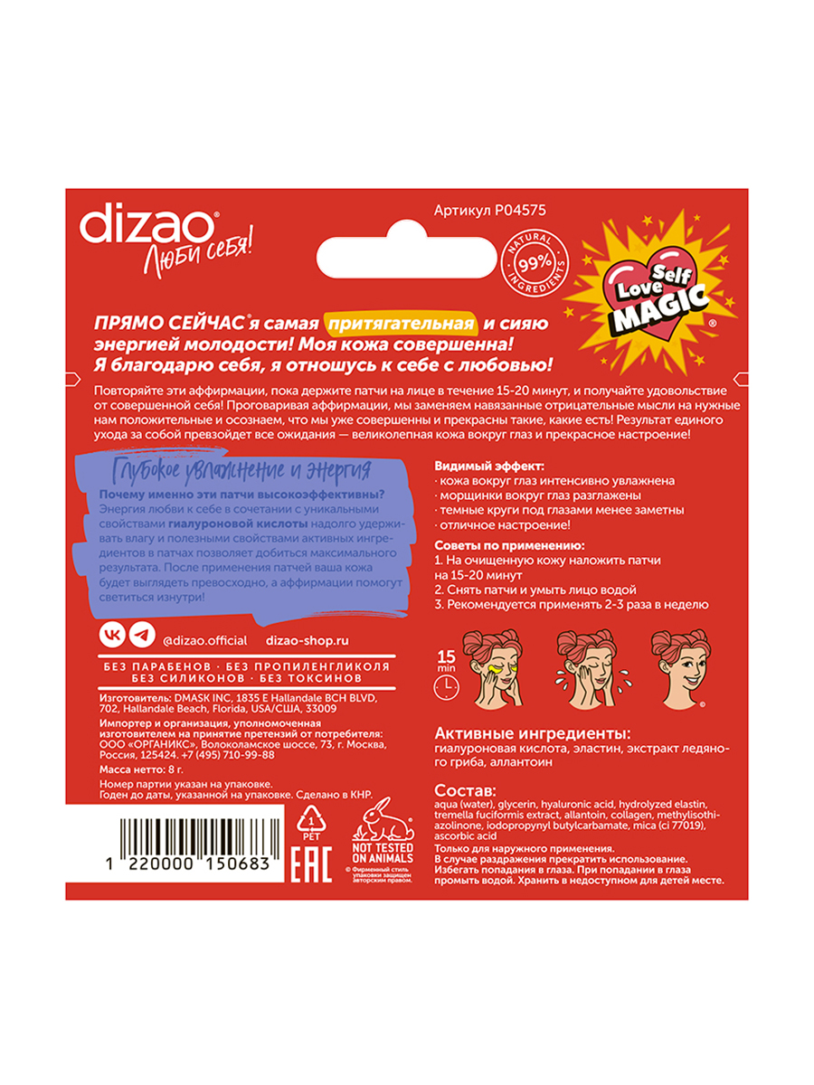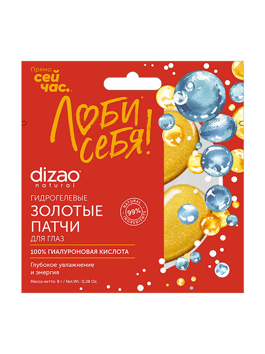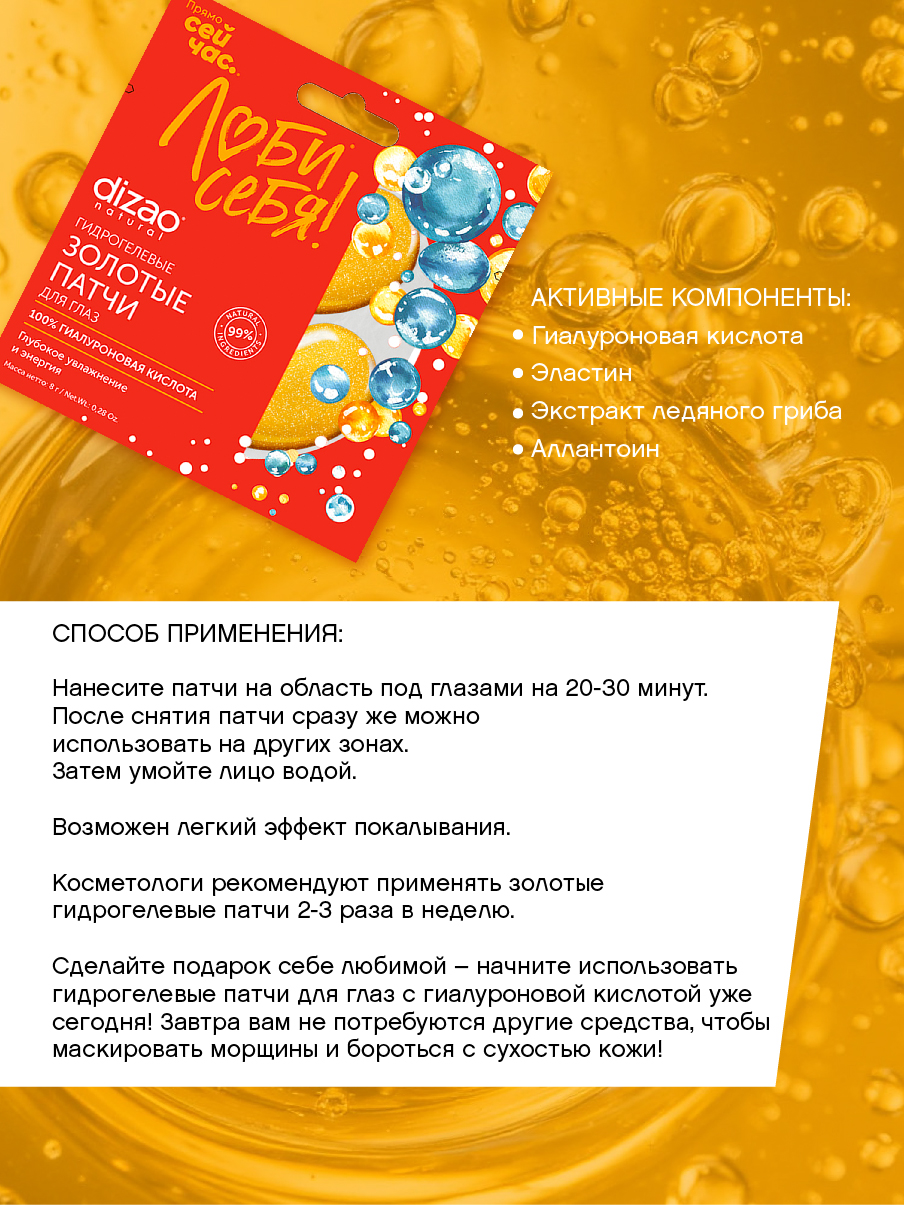 Гидрогелевые золотые патчи для глаз Dizao «100% гиалуроновая кислота». Глубоко увлажняют и разглаживают морщины вокруг глаз, создавая эффект мощного омоложения. Гиалуроновая кислота обеспечивает увлажнение глубоких слоев кожи, восполняя дефицит влаги. В состав также входит лебяной гриб тремелла, который обладает антивозрастными свойствами, а также содержит в себе витамин D, аминокислоты и полезные белки и минералы. В патчах также содержится эластин, улучшающий вид кожи, и аллантоин, который стимулирует регенерацию тканей. Патчи Dizao безопасны в использовании и гарантируют эффективный результат. В каждой упаковке 5 пар патчей!