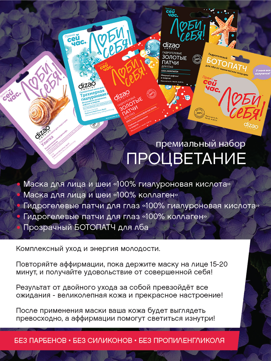 В подарочный набор включены самые популярные одноразовые маски и патчи от отеков и мешков, а также от синяков. Все, что нужно для полноценного домашнего ухода за кожей лица собрано в подарочной коробке.Набор для женщин косметический состоит из масок, которые дают эффект контурной подтяжки лица, глубокое увлажнение, омоложение и питание. В beauty box маски эффективно предотвращающие раздражение и шелушение, мимические морщины, придающие лицу свежесть и сияние. В наборе Dizao - коллагеновая маска для лица антивозрастная, подтягивающая с лифтинг эффектом и маска 100% гиалуроновая кислота - увлажняющая с гиалуроновым кремом. А также гидрогелевые золотые и прозрачные патчи для глаз и лба в индивидуальной упаковке с блестками. Патчи для кожи вокруг глаз помогают вернуть себе свежий взгляд: 100% гиалуроновая кислота - глубоко увлажняют кожу, 100% коллаген - восполняют недостаток коллагена, а ботопатч на лоб разгладит морщины. Маска тканевая идеально подойдет на каждый день и для курсового применения. Косметика Дизао состоит на 99% из натуральных ингредиентов - отличный подарок для любимых. Без парабенов без пропиленгликоля без токсинов. Люби себя!