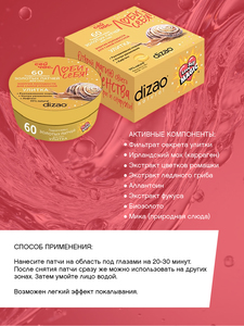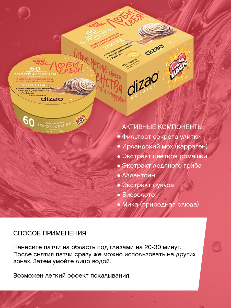 60 гидрогелевых золотых патчей Dizao «Улитка». Разглаживание морщин, ультра увлажнение и лифтинг. Фильтрат секрета улитки — один из самых совершенных и натуральных элементов, которые можно встретить в современной косметике. Он обладает сильными регенерирующими и ранозаживляющими свойствами. В нем содержаться фибробласты, которые регенерируют клетки кожи и оказывают омолаживающее воздействие, а также эластин и коллаген, которые повышают упругость и эластичность. Состав патчей на 99% состоит из натуральных ингредиентов. В банке хранится 60 ботопатчей, что идеально для комплексного использования, который поможет добиться наилучшего эффекта!