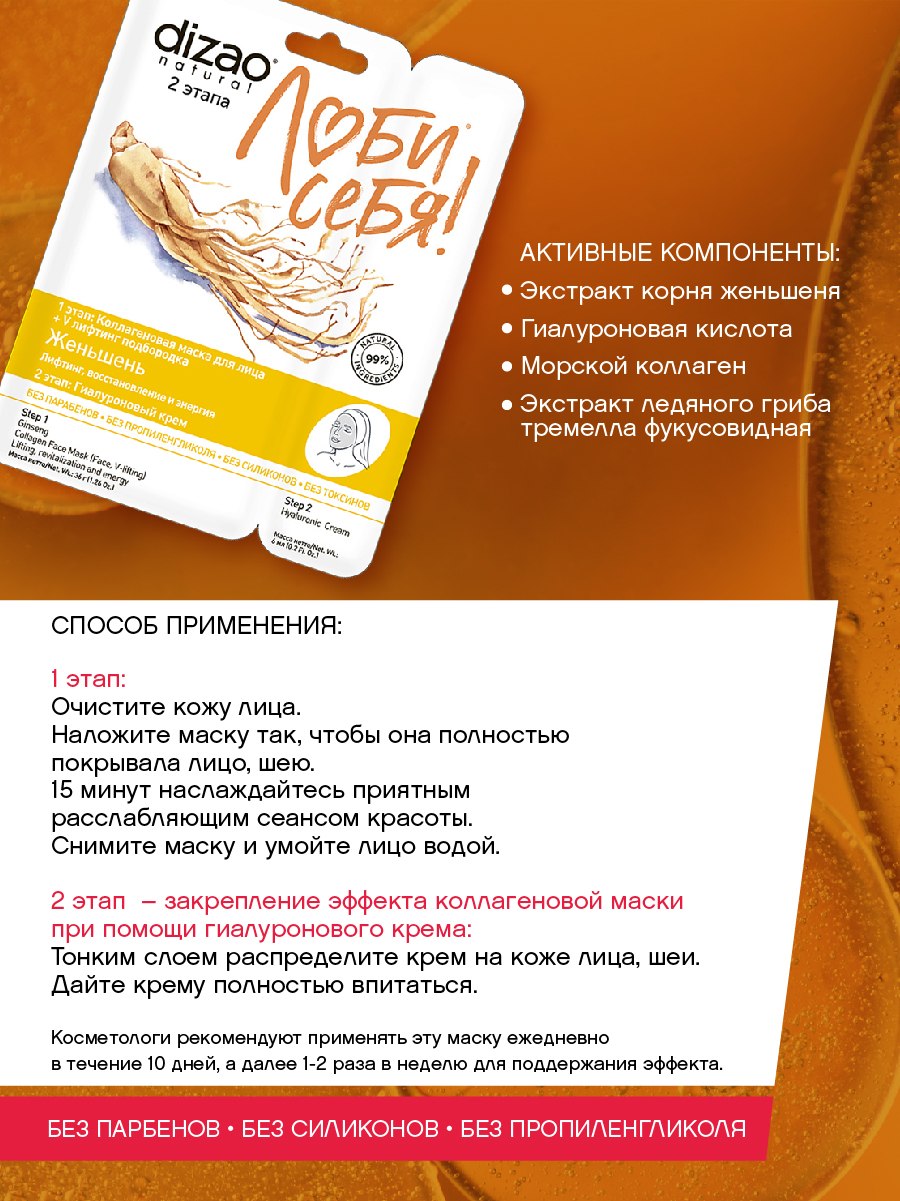 Двухэтапная коллагеновая маска для лица, шеи, век Женьшень, экспресс-уход за кожей. Тонизирующая маска с коллагеном - безотказное средство при борьбе с усталостью и сухостью кожи. Второй этап Гиалуроновый крем закрепляет положительный результат от использования коллагеновой маски. Женьшень, главный действующий компонент маски, комплексно воздействует на клетки кожи. Он стимулирует внутриклеточные обменные процессы и насыщает клетки кислородом, оказывает бактерицидное воздействие и защищает от УФ-спектра, запускает процессы обновления во всех слоях кожи.Действие маски: Повышение тонуса и тургора кожи. Глубокое увлажнение. Тонизирование кожи. Повышение уровня выработки собственного коллагена. Избавление от признаков усталости (мешки под глазами, морщинки).
