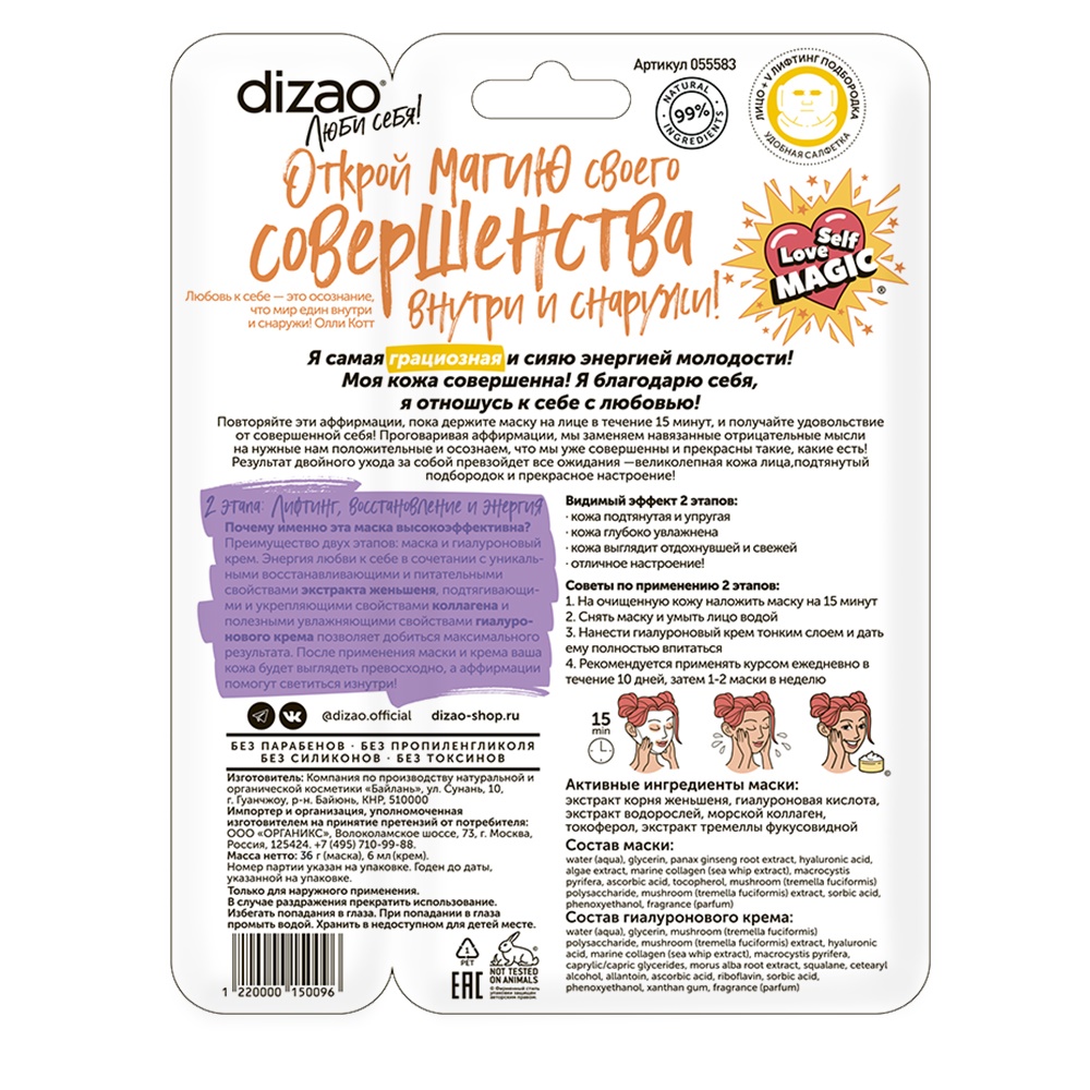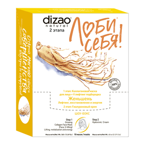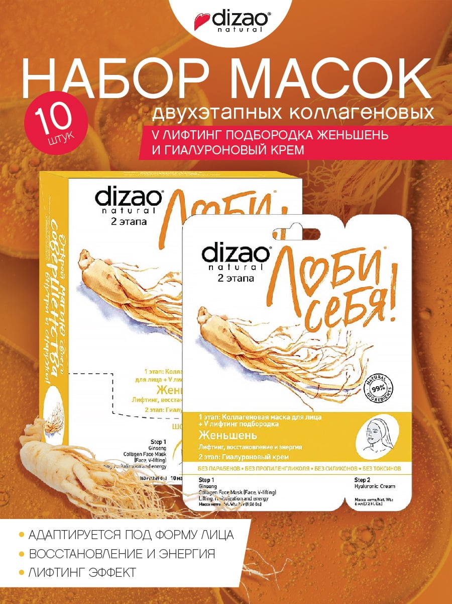 DIZAO Набор Маска двухэтапная коллагеновая д/лица + V Лифтинг подбородка Женьшень "Лифтинг, восстановление и энергия" и гиалуроновый крем, 10 штук