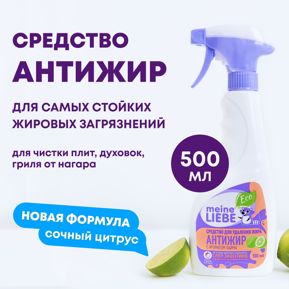 3. MEINE LIEBE Чистящее биоразлагаемое средство для удаления стойких пригоревших загрязнений АНТИЖИР, 500 мл: >30%: вода деминерализованная; 5-15%: щелочной компонент; < 5%: НПАВ, экстракт лайма, ароматизатор.