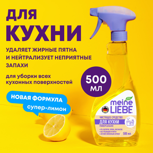 4. MEINE LIEBE Универсальный чистящий ЭКО-спрей для кухни гипоаллергенный с экстрактом лимона 500мл: >30%: вода деминерализованная; < 5%: АПАВ, органический растворитель жира, функциональные добавки, органический экстракт лимона, краситель, консервант, ароматизатор.