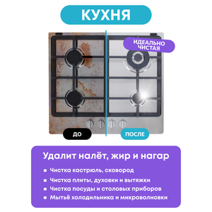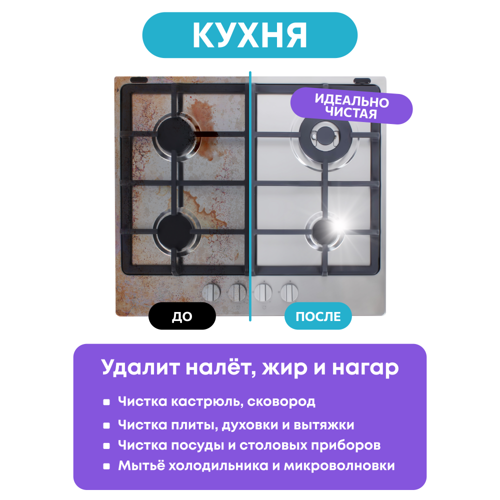 Очищает кухонные поверхности и приборы: холодильник, варочную поверхность, духовку, микроволновку, вытяжку и сетку от жира. Чистит кастрюли и сковородки от нагара, жира и налета. Отмывает посуду, столовые приборы, разделочные доски и детские бутылочки.