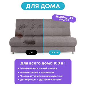 Очищает мягкую мебель, ковры, пол. Отмывает лотки домашних животных и устраняет запахи.