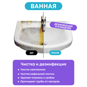 Чистит поверхности в ванной: сантехнику, раковину и ванную от налета. Очищает плитку и межплиточные швы. Борется с плесенью и грибком. Прочищает трубы от засоров.