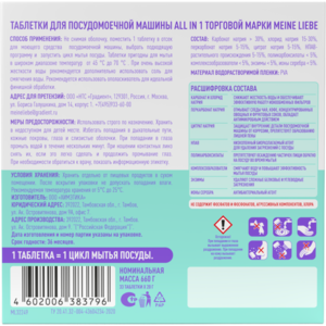 Мы стремимся сделать вашу ежедневную стирку, уборку и мытьё посуды максимально эффективными и простыми, чтобы вы всегда были довольны результатом.Таблетки для посудомоечных машин ALL in One от MEINE LIEBE – это надежный помощник вашей семьи. Благодаря специальной формуле с энзимами, ионами серебра и кислородным агентом, посуда и столовые приборы будут сиять.