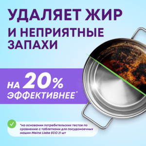 Энзимы и растительный Поверхностно Активные Вещества безупречно удаляют засохший жир, неприятные запахи даже на коротких циклах и ЭКО-режиме мытья посуды.