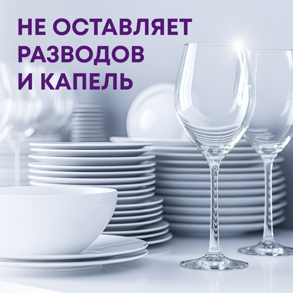 Таблетки упакованы в водорастворимую оболочку, которую не нужно снимать, легко смываются водой, не оставляют налет и разводы и не требуют дополнительного добавления соли.