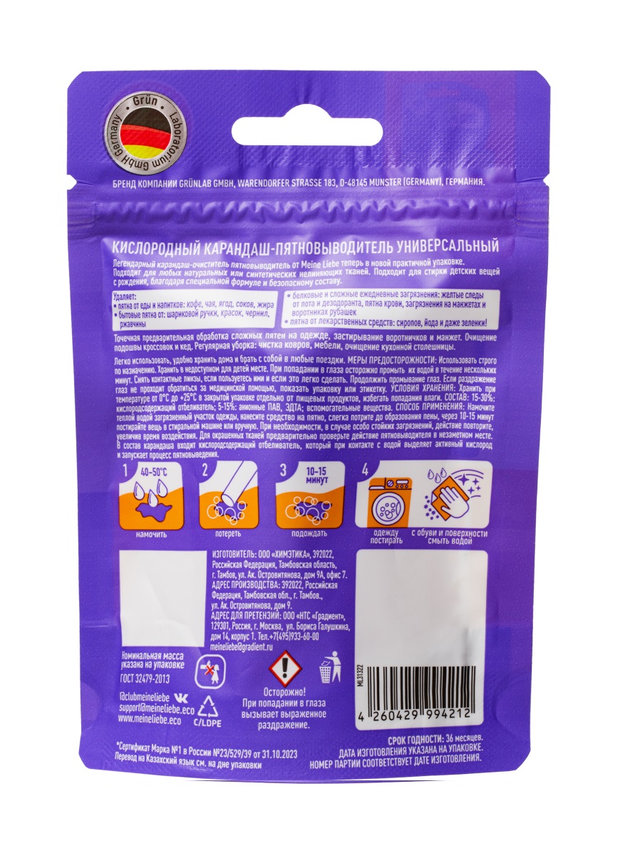 Экологичный, универсальный кислородный карандаш Майне Либе – это эффективное, многофункциональное средство для удаления всех видов загрязнений и предварительной обработки цветных и белых тканей. Кислородный карандаш в формате стика без следа удаляет загрязнения (в том числе застарелые), разрушая структуру загрязнения, а молекулы ПАВ удаляют частицы загрязнения с вещи в процессе стирки. Благодаря поверхностному способу удаления, процесс безвреден для окрашенных и деликатных изделий, бережен к тканям. Эффективное очищение - Эффективная концентрация ПАВ и активный кислород в составе карандаша справляется с такими видами загрязнений, как от губной помады и тонального крема, кофе, чая, вина, соков, ягод и овощей, шариковой ручки, фломастера йода, зеленки, крови, кетчупа, сажи и жира. Экологический кислородный карандаш подойдет для предварительной обработки воротников и манжет рубашек, детской и взрослой одежды, ковров, обивки автомобиля и других текстильных тканей. Средство компактно и универсально, подойдет для поездок в отпуск и неожиданных загрязнениях вне дома, когда срочно нужно убрать/минимизировать пятно. Кислородный карандаш прост в использовании: Нанести средство на загрязнение, предварительно смоченное водой, потрите ткань. Подождите 15 минут и постирайте вещь подходящим к данному типу ткани стиральным порошком Meine Liebe. При необходимости, в случае особо стойких загрязнений, действие повторить! В случае выведения загрязнений на цветной ткани рекомендуется предварительно опробовать действие средства на небольшом незаметном участке текстиля. Безопасная формула для дома и человека Бытовая химия Meine Liebe производится по уникальной формуле под контролем качества компании Grunlab (Германия), что гарантирует их надежность, эффективность и безопасность. Состав и упаковка средств биоразлагаемые, не содержат хлора, фосфатов, фосфонатов не загрязняют окружающую среду и полностью