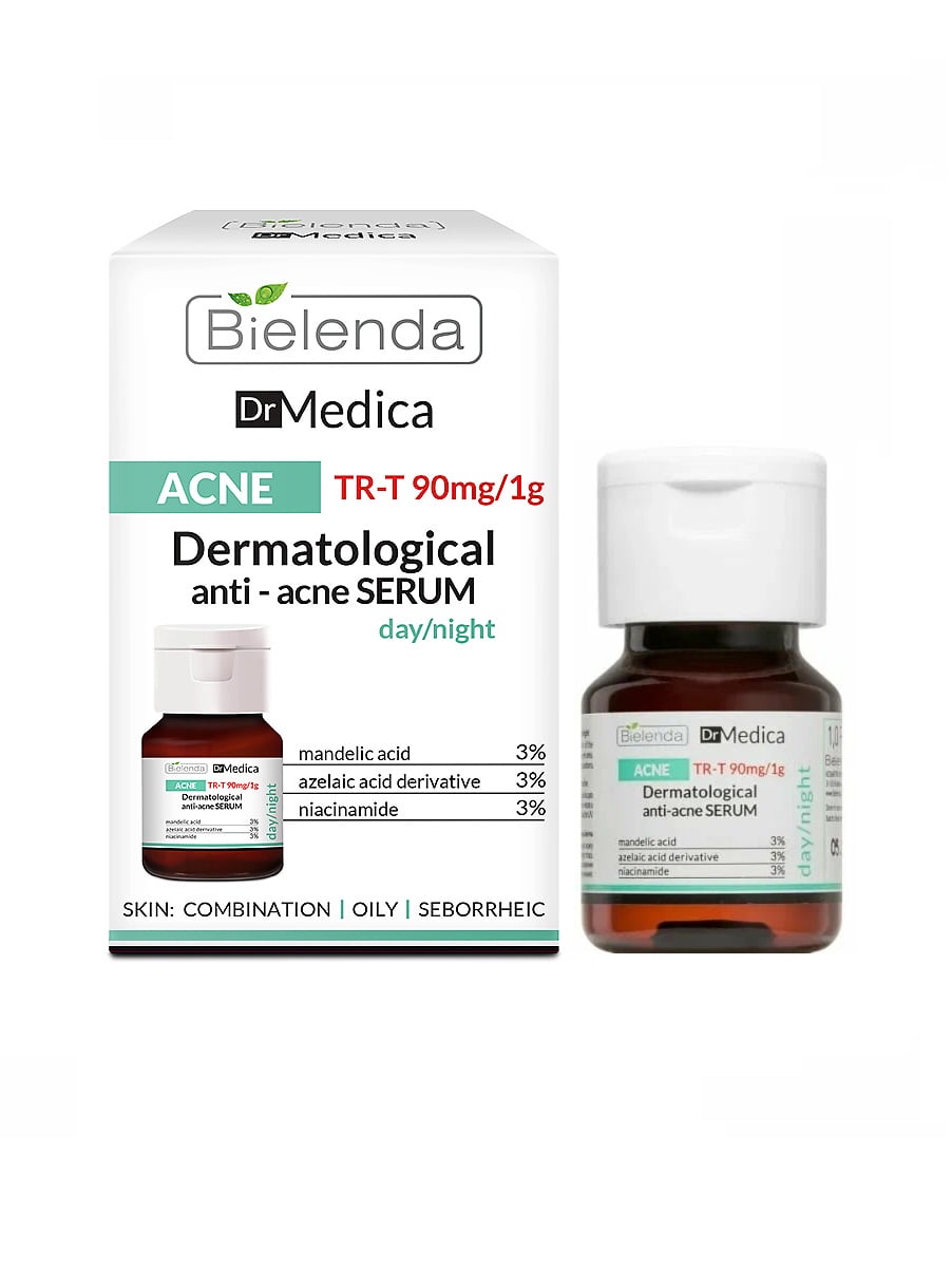 Для комбинированной; жирной кожи и кожи с себореей. Дерматологическая сыворотка DR MEDICA ACNE осветляет пигментацию; очищает и сужает расширенные поры; а также насыщает кожу необходимой влагой. Входящая в состав азелаиновая кислота препятствует размножению болезнетворных бактерий; провоцирующих возникновение акне. Миндальная кислота оказывает антибактериальное действие; лактобионовая кислота отшелушивает ороговевшие клетки; а витамин В3 борется с пигментацией и укрепляет структуру кожи. ПРИМЕНЕНИЕ: нанести небольшое количество средства на сухую чистую кожу лица или точечно на проблемные участки. Не смывать. Избегать области вокруг глаз. Использовать 2-3 раза в неделю; самостоятельно или в качестве основы под крем. При применении днем избегать попадания прямых солнечных лучей на кожу; применить UV-защиту. Для достижения максимального эффекта рекомендуется использовать с другими средствами из серии Bielenda Dr Medica Acne.