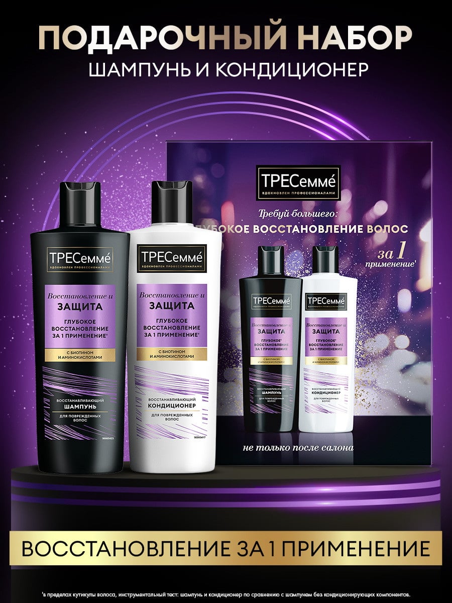 Подарочный набор для женщин ТРЕСемм Глубокое восстановление и защита — это идеальный подарок для женщин и девушек, чьи волосы стали ослабленными и поврежденными из-за регулярных термических укладок и окрашиваний. В стильной подарочной упаковке содержатся базовые средства для ежедневного ухода за поврежденными локонами: шампунь для волос и кондиционер, которые обеспечивают глубокое’ восстановление и питание прядей.Особая* формула шампуня для волос и кондиционера из коллекции уходовых средств Восстановление и Защита, обогащенная биотином и аминокислотами, работает с каждым волосом, восстанавливает и питает его изнутри. Благодаря насыщенной формуле эти уходовые средства обеспечивают глубокое’ восстановление безжизненных и истонченных волос за 1 применение’’. Шампунь и кондиционер для поврежденных волос эффективно уменьшают ломкость и количество секущихся кончиков.
